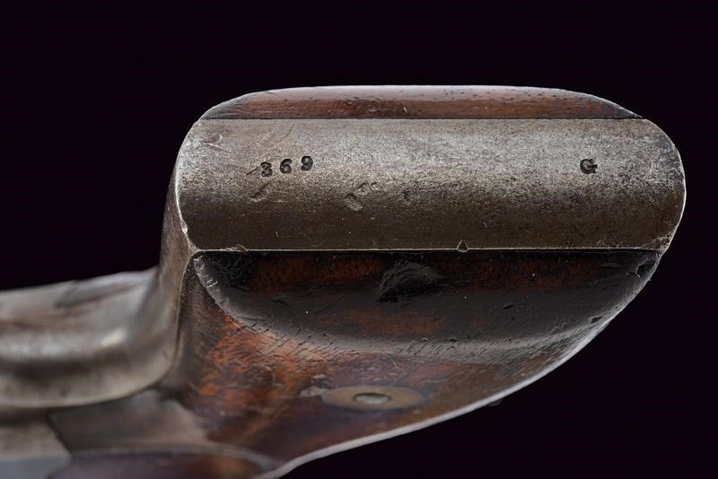 Octagonal, rifled, 4", 36 cal barrel (visible rifling, some deposits inside), with brass front sight, featuring a standard two-line back mark with patents up to 1861. Grooved, five-shot cylinder e with patents up to 1861. Small remains of antique browning. Working mechanism, the cylinder block with the hammer pulled needs revision. Frame with remains of 1859 patent, spur trigger. Some pitting. Serial number "3xx" on the grip, and with mark "G". Walnut grips. Some parts with remains of finishing.
