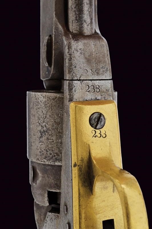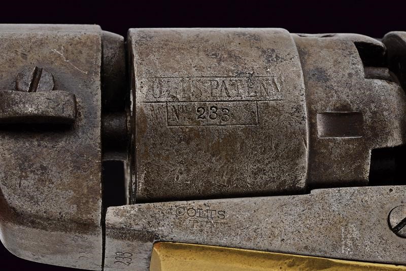 6-1/2", round, 36 cal. barrel (some pitting inside, visible rifling), marked "ADDRESS COL SAM.L COLT NEW-YORK US AMERICA" on the back. Barrel wedge with numbering matching with the other parts. Rebated, five-shot cylinder with remains of stagecoach scene; legible patent and serial number matching the frame. Working mechanism. Frame with serial number "2xx", traces of the same serial number at the base of the barrel and clearly visible and matching numbering on the grip straps. These both made of brass. Pin of the cylinder without numbers, "B" mark inside. Iron surfaces with signs of use, time and pitting. Trigger guard marked "36 CAL". Walnut grip.