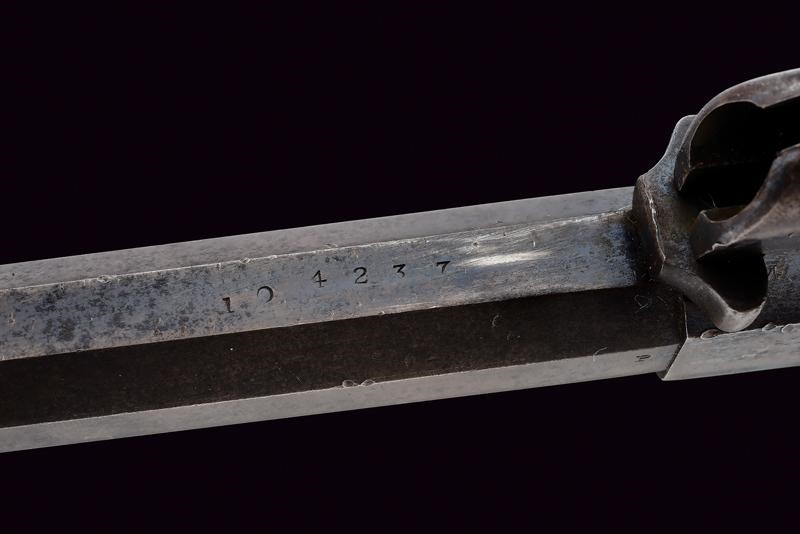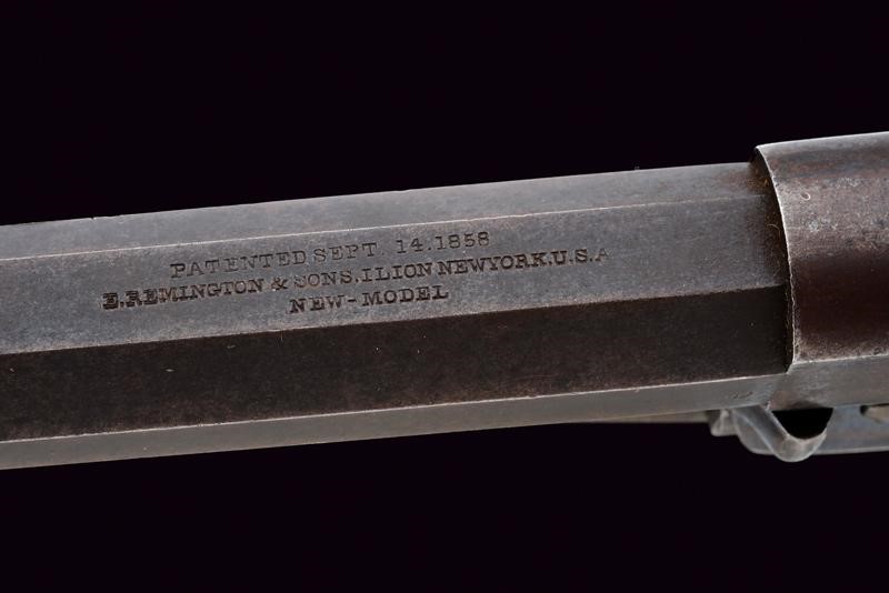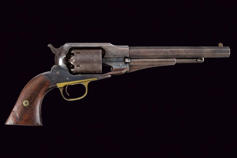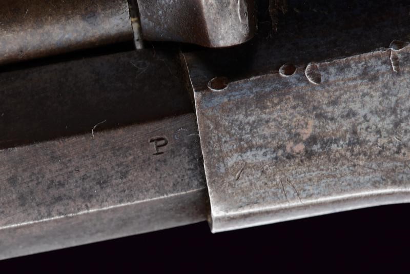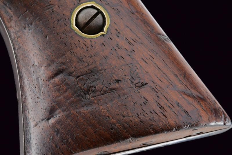 8" rifled, octagonal, 44 cal barrel (bore in good condition, visible rifling), provided with foresight, featuring the standard three-line mark "NEW MODEL" on the back, with marks "D" and "P". Six-shot cylinder marked "C" and "H". Well-working mechanism. Brass trigger guard. Some signs of use and time. Remains of antique bluing. Serial number "104xxx" on barrel and handle. Wooden grips, the left one with remains of military inspection stamp.
