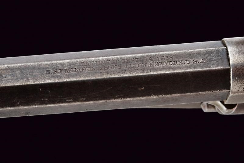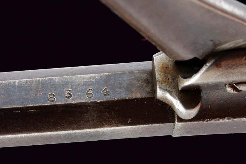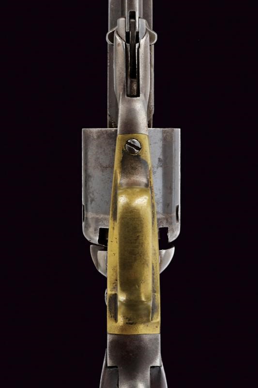 6-1/2", rifled, octagonal, 36 cal. barrel (bore with some scaling, visible rifling), with a semi-circular foresight, featuring a three-line mark at the back, with patent of 1858 only, and the inscription "NEW MODEL". Five-shot cylinder. Working mechanism. Brass trigger guard with remains of finishing. Some signs of use and time and slight pitting. The cylinder and the barrel with remains of antique browning. Serial number "83xx" on the barrel and the grip. Walnut grip scales.