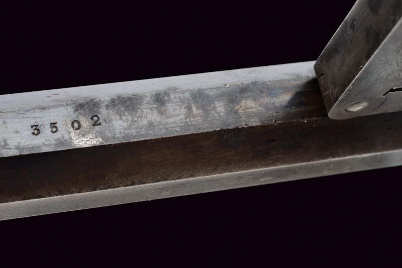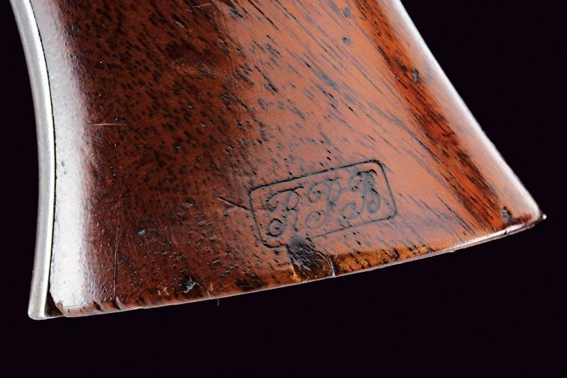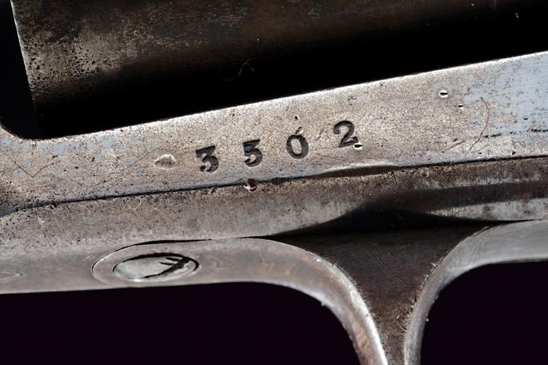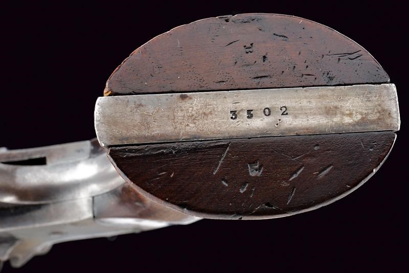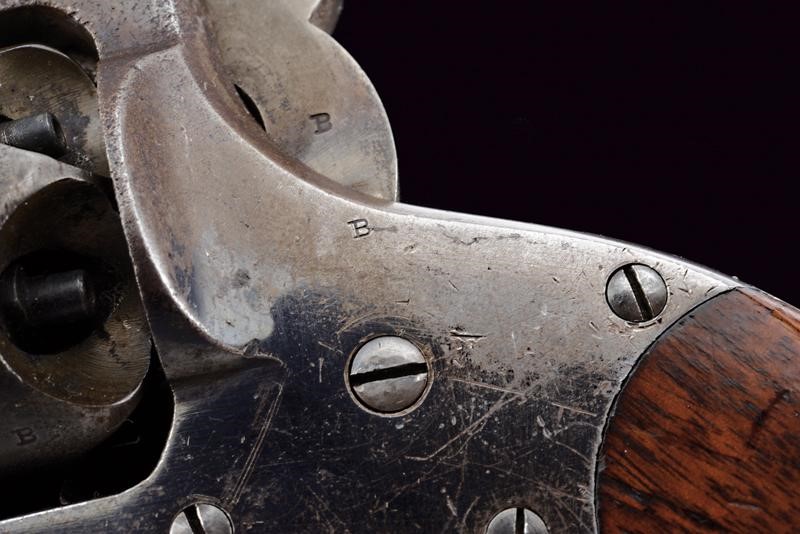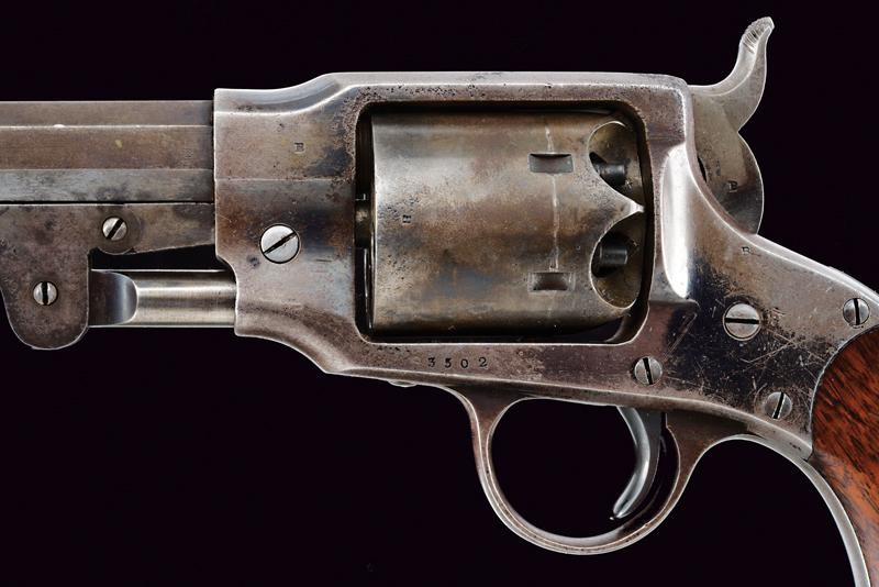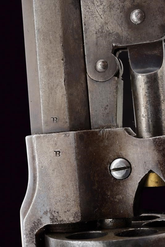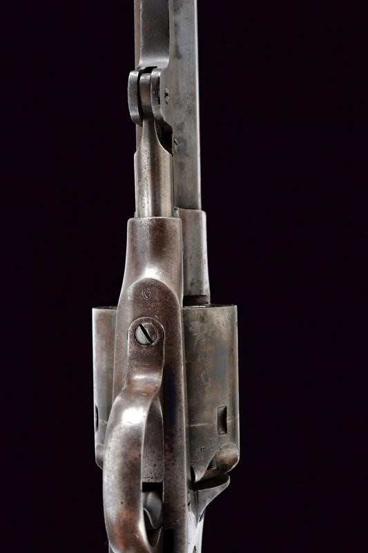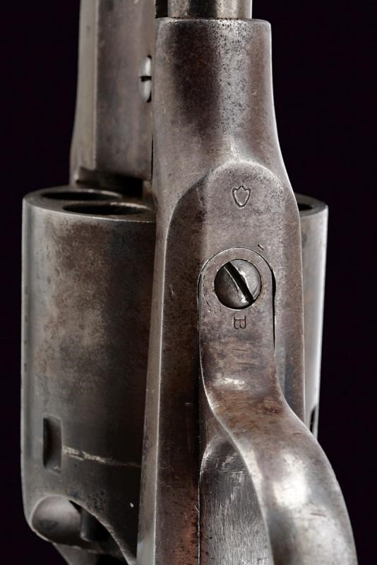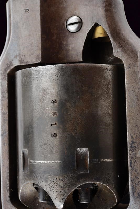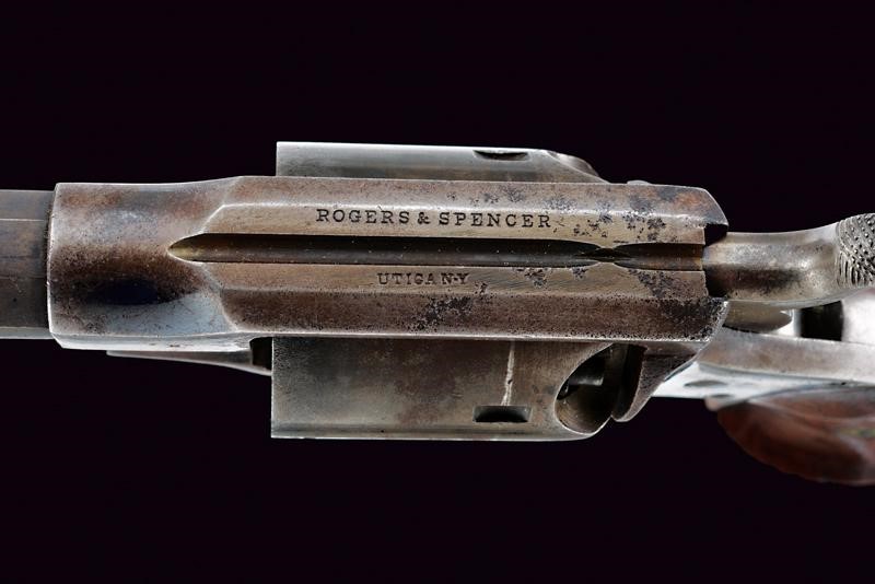 Octagonal, rifled, 44 cal barrel (clean bore, visible rifling), provided with cusped, brass front sight, marked "B" at base, Smooth six-shot cylinder marked "B". Well working mechanism. Frame with dorsal marking "ROGERS & SPENCER / UTICA N.Y.", "B" and a shield-shaped stamp on the underside. Serial number "35xx" matching on barrel, cylinder, frame and grip. Limited areas of pitting on cylinder and frame. Remains of old bluing. Wooden grips, the left one with clearly visible government inspection mark (RPB).
