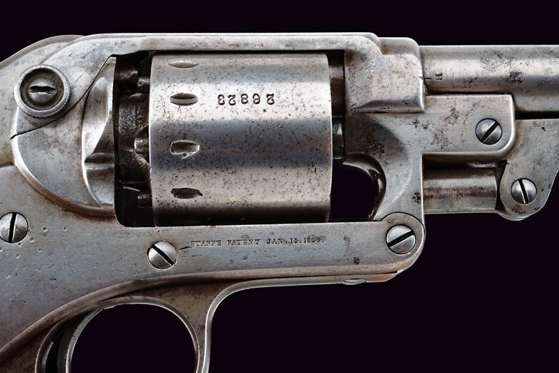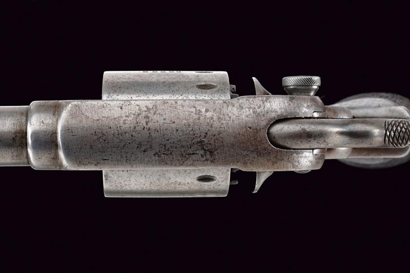 Cylindrical, rifled, 44 cal barrel (clean bore, visible rifling) provided with front sight, base with marks "C" and "B". Six-shot cylinder with serial number "26xxx". Working mechanism. Frame with company and patent markings on the sides, and with stamp "C" on both elements. Marked "R" and with serial number matching with the cylinder, the same number is also inside the cock housing. Some pitting, especially on the back of the cylinder. Smooth wooden handle.