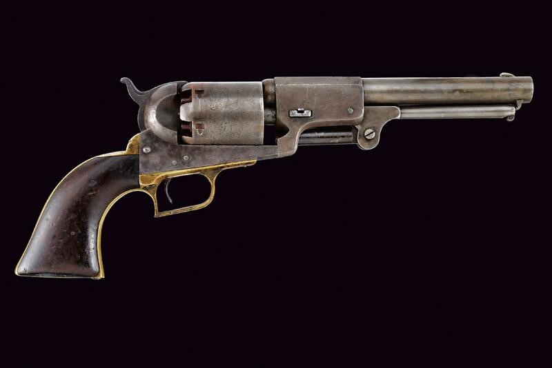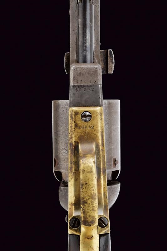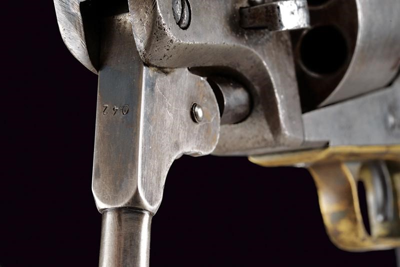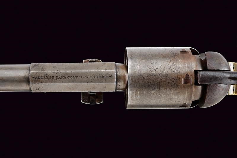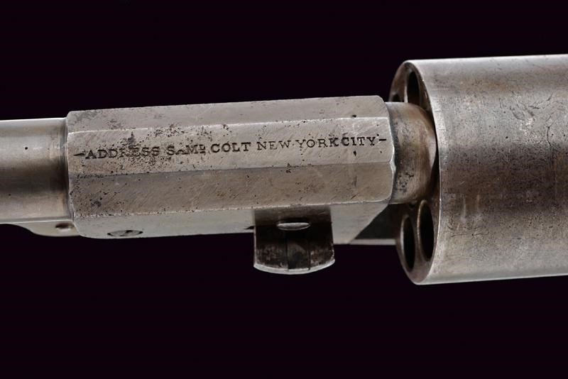 Cylindrical, 7-1/2", 44 cal. barrel (pitting and scaling inside, visible rifling) with octagonal base, with low German silver foresight, marked "ADDRESS SAM.L COLT NEW YORK CITY" in curly brackets, the inscription is oriented towards the breech. Smooth, six-shot cylinder with rectangular notches, remains of engraving depicting a fight between Texas Rangers and Indians (not clearly legible) and the cartouches almost completely faded, the serial number is no longer legible. Working mechanism. Frame marked "COLTS PATENT" and "U.S." with serial number "10xxx". Central pin of the cylinder with serial number matching the frame. Brass lower band and squared trigger guard with serial number matching the frame. Brass back band with matching serial number (probably re-stamped) under the grip. Barrel with serial number matching the frame. The cartridge rammer and the barrel wedge also with matching serial numbers (possibly re-stamped). Various areas of pitting. Smooth walnut grip without stamps.