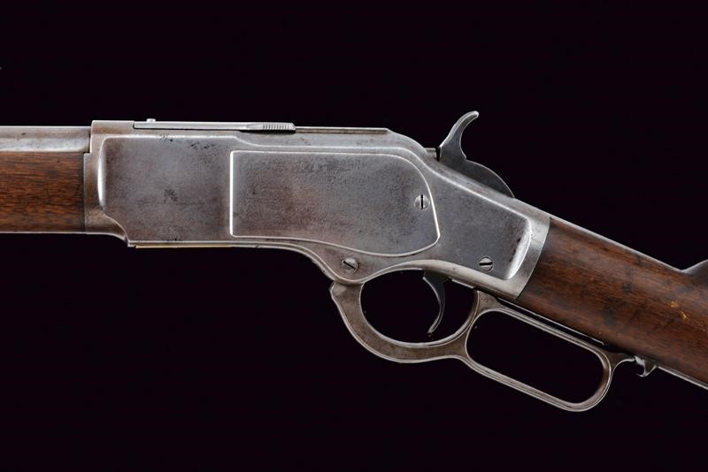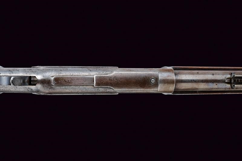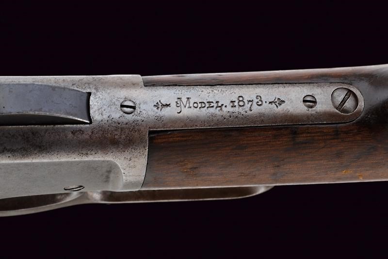 Round, rifled barrel, provided with foresight and adjustable rear sight, marked with the company address, "KING'S IMPROVEMENT" and patents up to 1860, mark of the calibre "44 W.C.F.". Bore with pitting, visible rifling. Frame with upper tang featuring the model mark, lower tang with serial number "264xxx B". Brass elevator block marked "44 CAL". Working mechanism. Smooth, walnut butt and fore-end with signs of use. Iron mounts. Smooth butt plate with pan. Third Model.