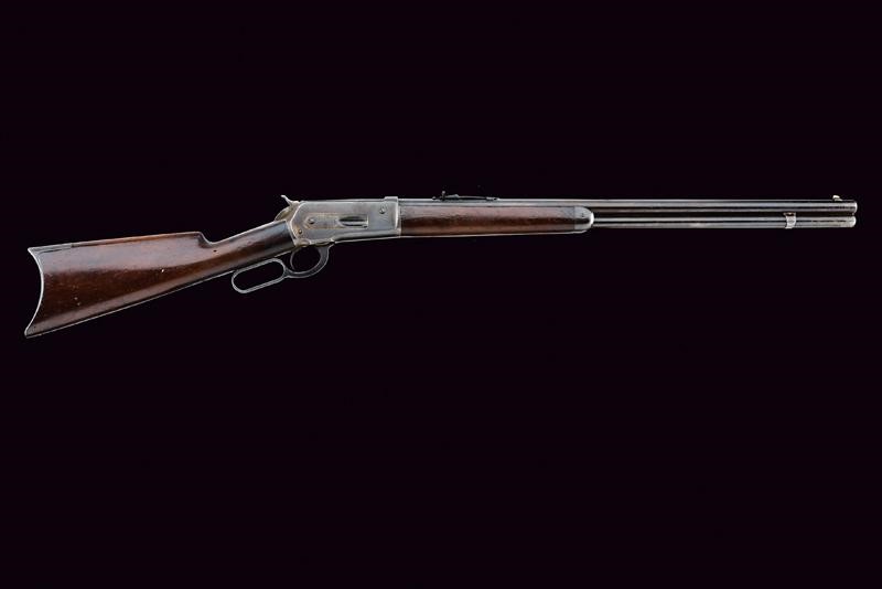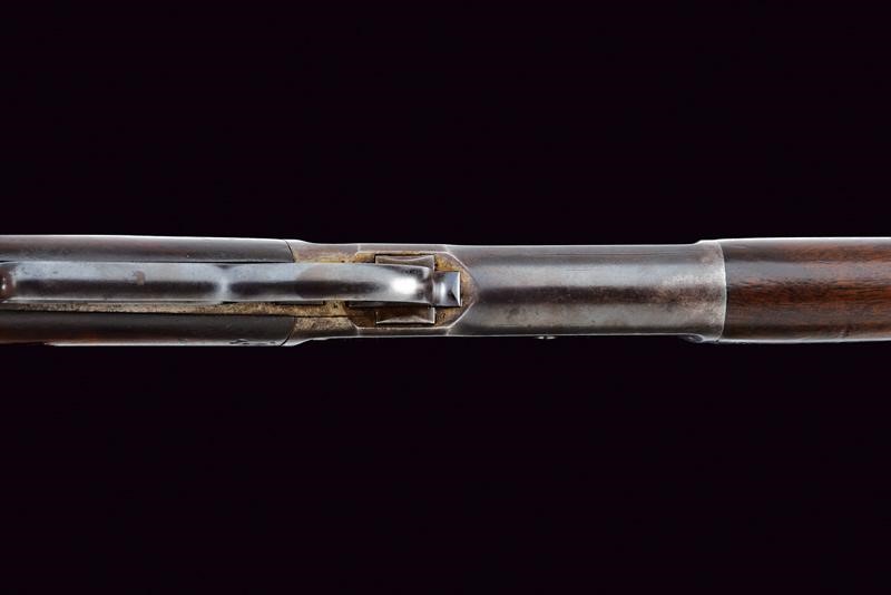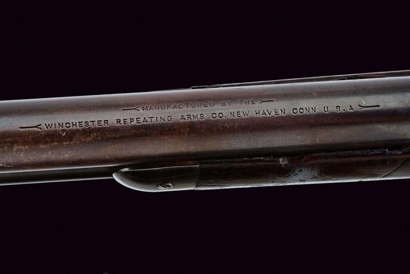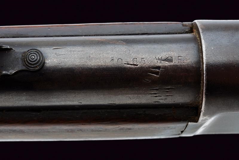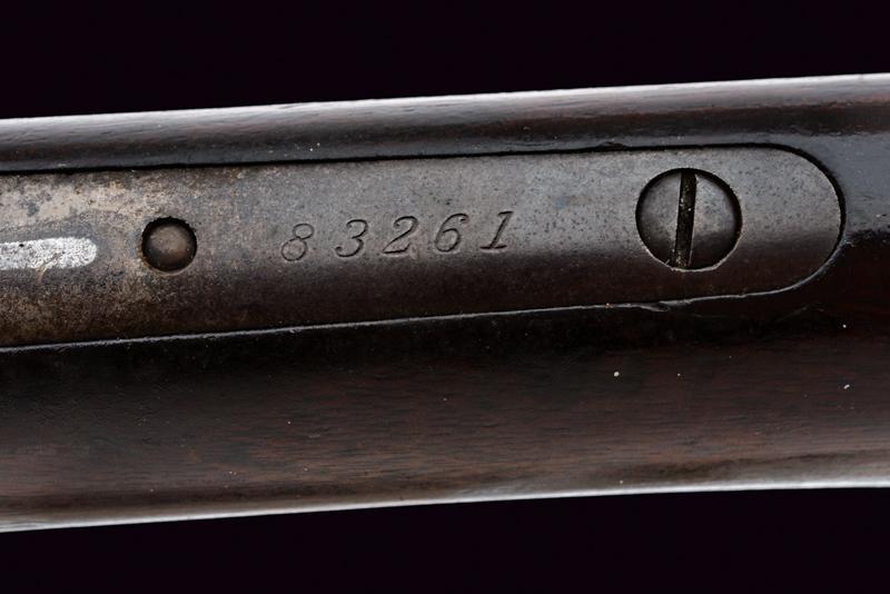Rifled, round barrel (some pitting inside, visible rifling) with address mark, breech marked "40-65 WCF", adjustable rear sight and foresight. Smooth, steel frame. Smooth, wooden butt and fore-end. Steel mounts. Dorsal tang with the model inscription. Serial number "83261". Remains of antique browning. Working mechanism.
