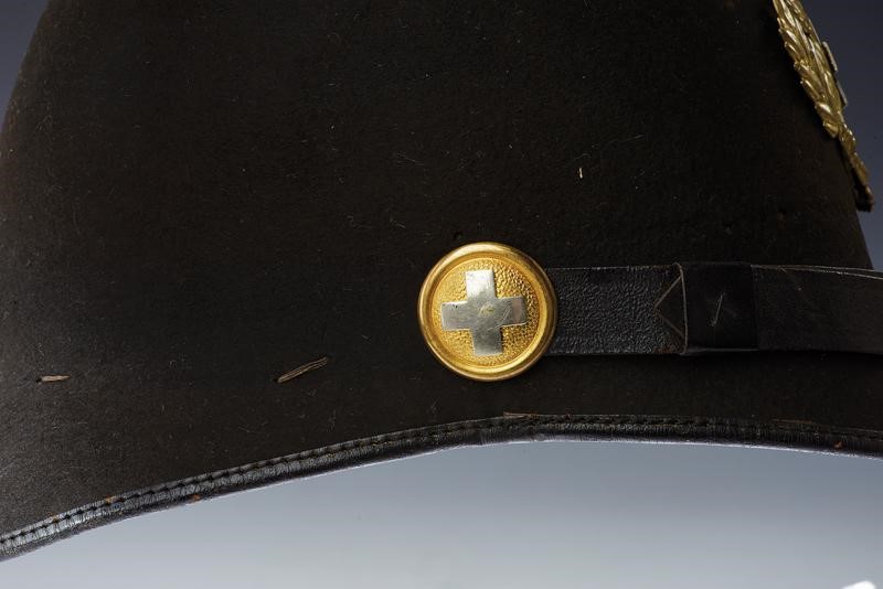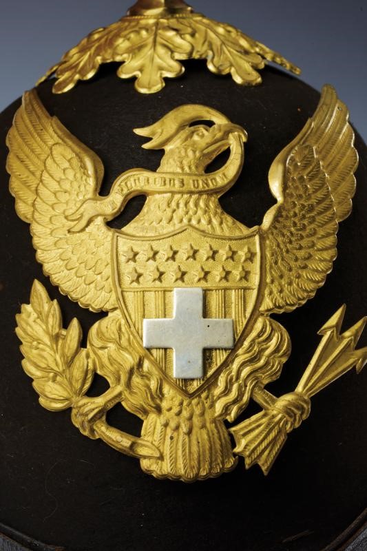 Semi-rigid skull covered with brown cloth. Gilded metal mounts. Top cusp with base featuring oak leaves. Front badge (a clutch is broken) depicting an US eagle with white metal health cross. Leather chin-straps with buttons featuring the cross. With fabric band and the manufacturer's stamp on the inner surface.