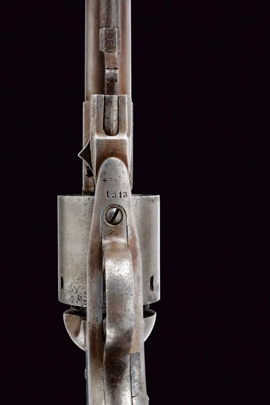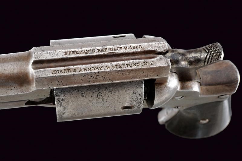 Cylindrical, rifled, 44 cal barrel (some pitting on the nozzle and inside, visible inside), with semi-circular front sight, numbered "14xx". Smooth six-shot cylinder. Working mechanism. Frame with serial number "15xx" and marked with "S", marked "FREEMAN'S PAT DEC.R 9 1862 / HOARD'S ARMORY, WATERTOWN, N.Y." on the back. Pitting. Dark, walnut grips.