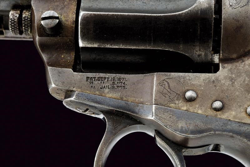 Rifled, round barrel (clean bore, visible rifling), with address and marking "COLT D. A. 38",with foresight; grooved, six-shot cylinder, frame with patents from 1871-1875, working mechanism; checkered wooden grip scales (small defects, sign of use); serial number "161xxx". Complete with its antique holster with belt.
