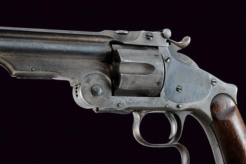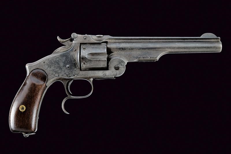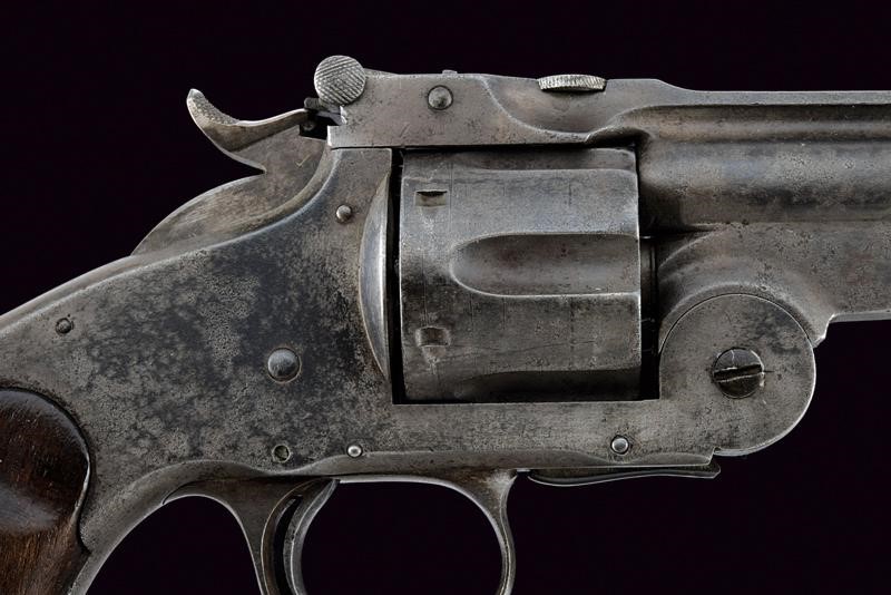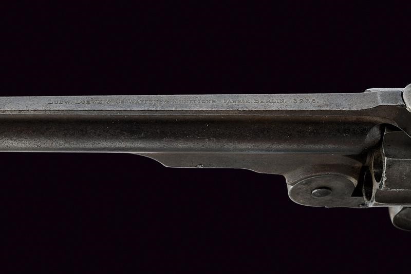 Round, rifled,, 6-1/2", S&W Russian 44 cal. barrel (clean bore, visible rifling), high rib with mark "LUDW. LOEWE & C.O WAFFEN -& MUNITIONS - FABRIK. BERLIN" and serial number "32xx", foresight consisting of one piece with the barrel. Grooved, six-shot cylinder with matching serial number. Frame "top brake", automatic extractor working properly. Working hammer-rifle mechanism. Trigger guard with finger support. Smooth wooden grip scales. Butt plate with matching serial number. Ring for the strap.