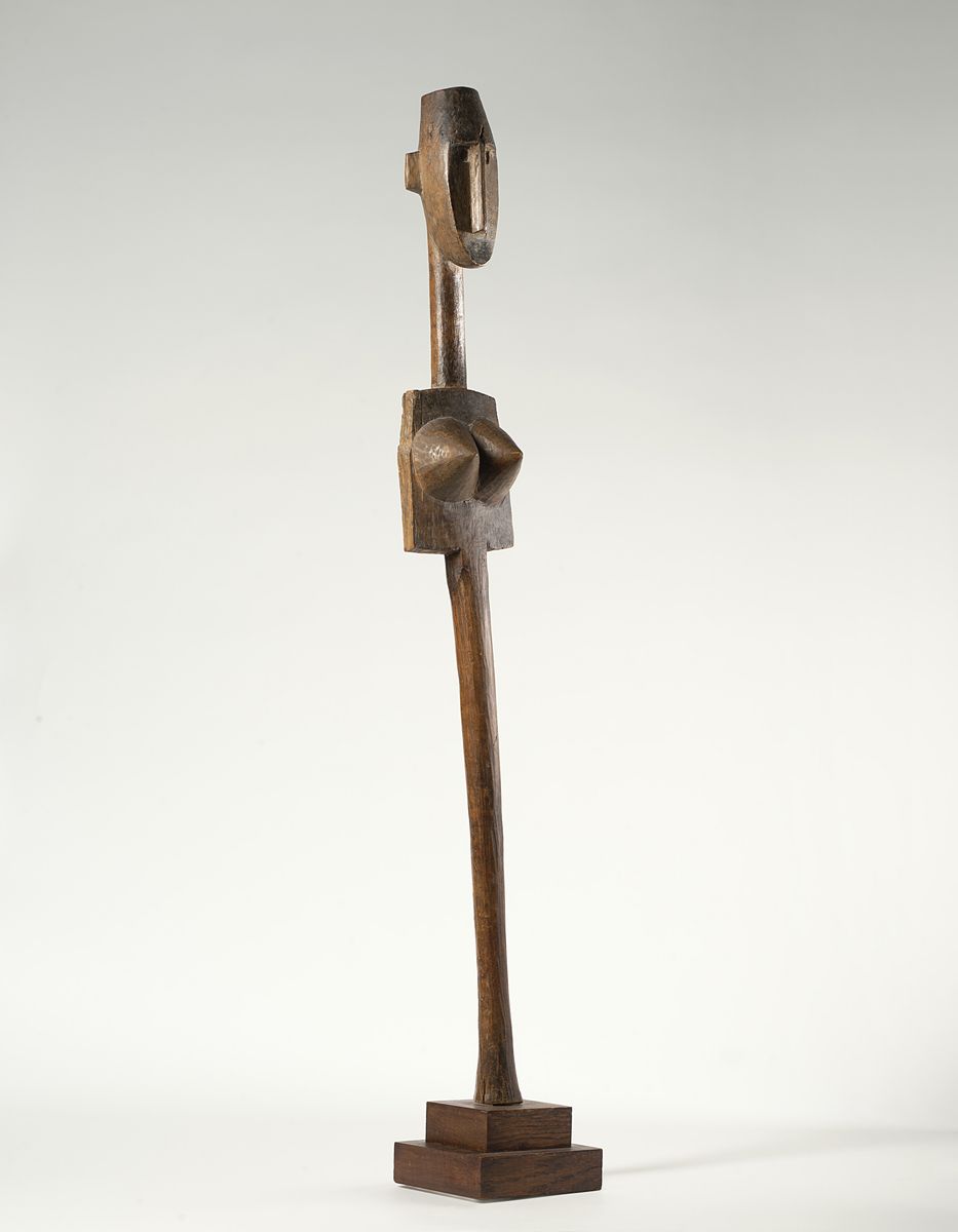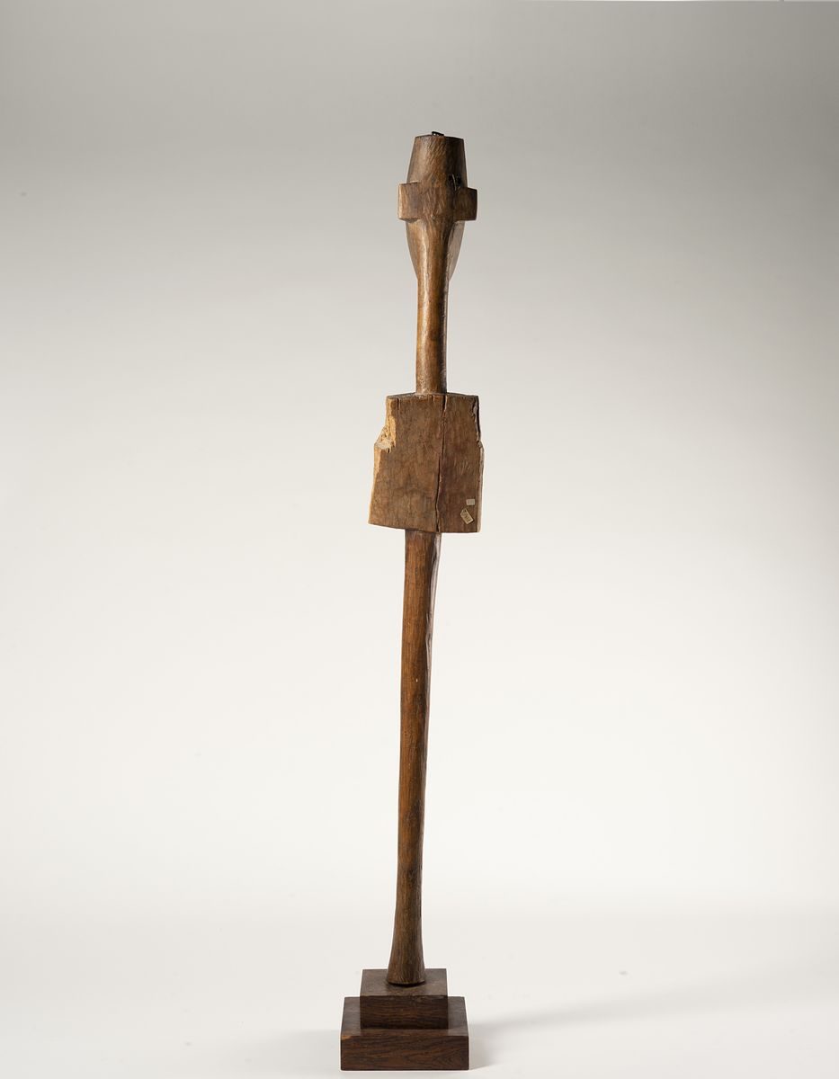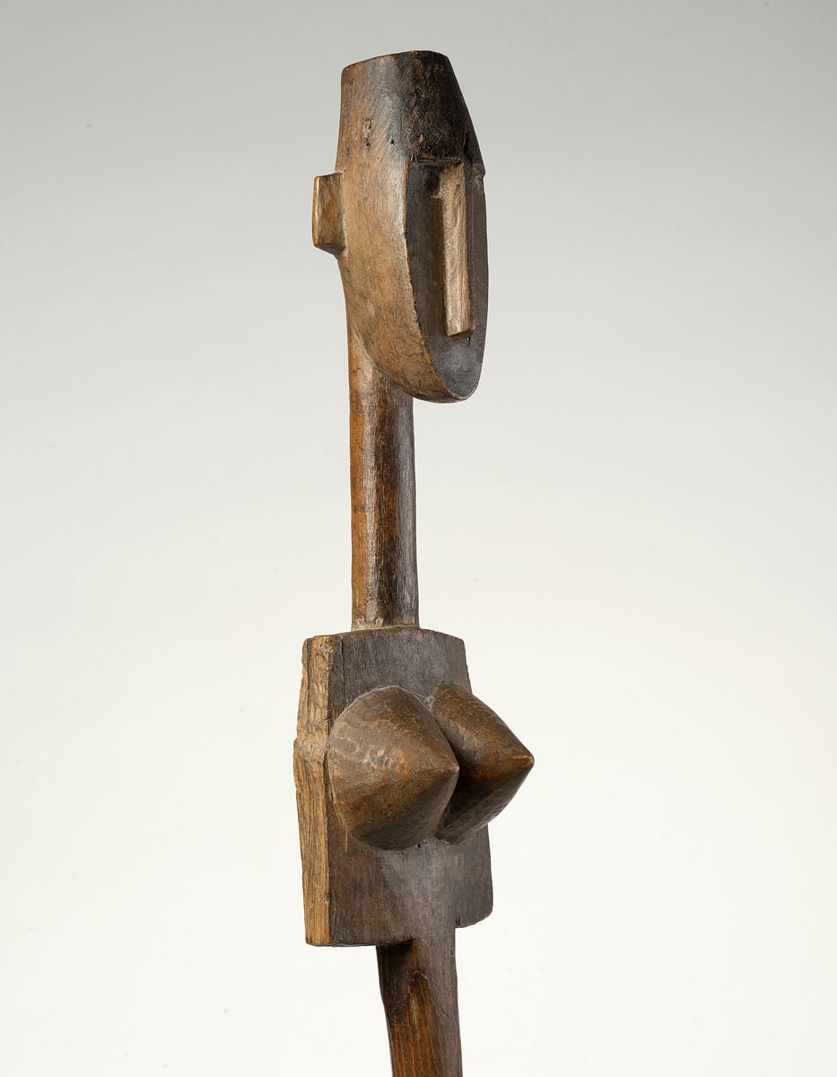It represents the chest of a female figure used as a puppet (Merekun).Sculpted according to traditional Bambara style, the face is carved in an enlarged oval shape which, at the top, becomes a horizontal line in correspondence with the broad forehead. A long nose surges down and divides the face in two parts, marked by circular eyes and characterised by a dark portion in the lower area. A cylindrical neck is inserted on the chest with squared shoulders, where a large cone-shaped bosom is highlighted. This female’s face, it seems that the sculptor wanted to capture a melancholy expression. Here, there is a clear stylistic chance that it would have influenced the faces and necks of the women that Modigliani painted and sculpted. At each side of the shoulders, there are several fractures which the sculpture has suffered throughout time. The moveable arms, now disappeared, were once attached to the body with large iron hooks. It is evident this puppet has been used given the smooth coating present on the rod, showing prolonged human contact.