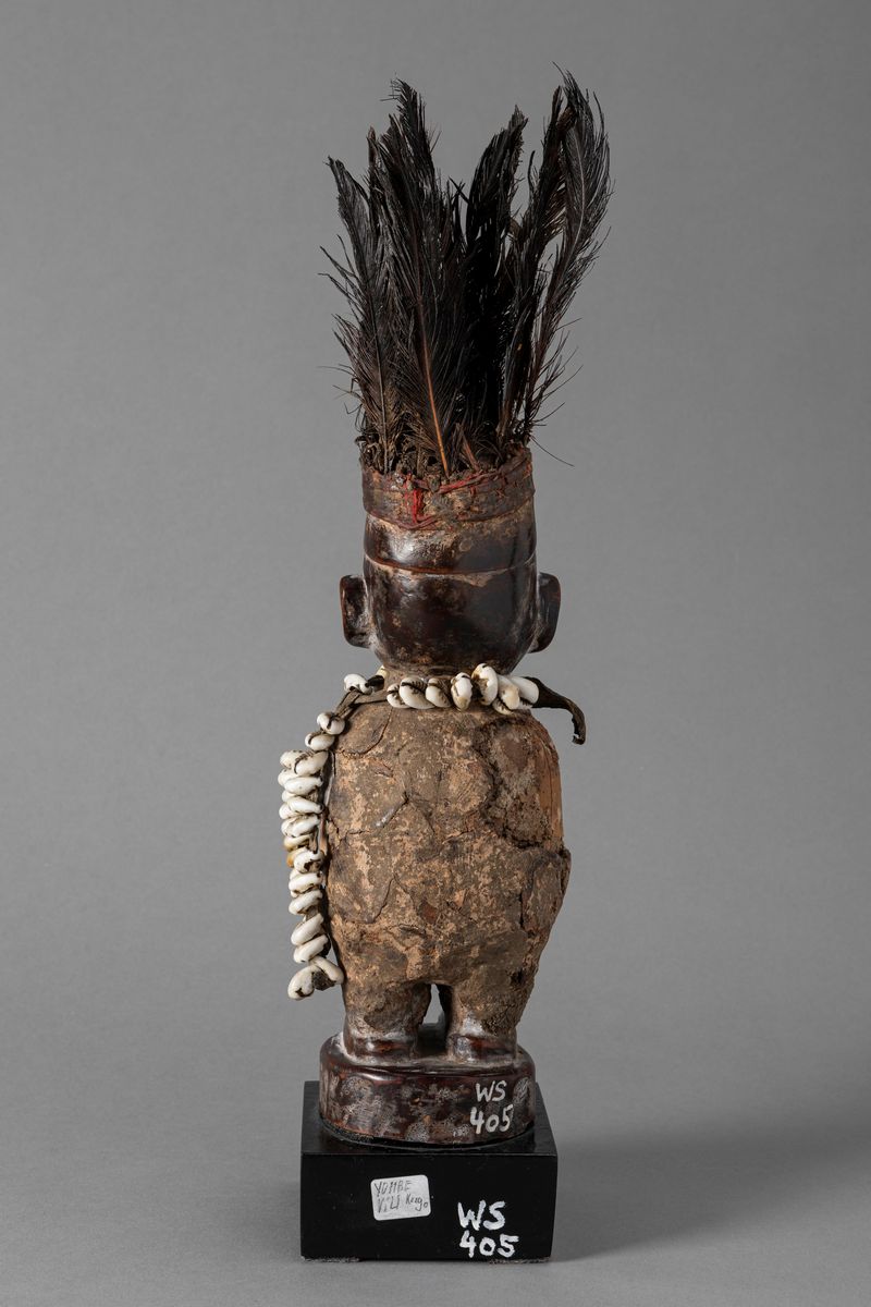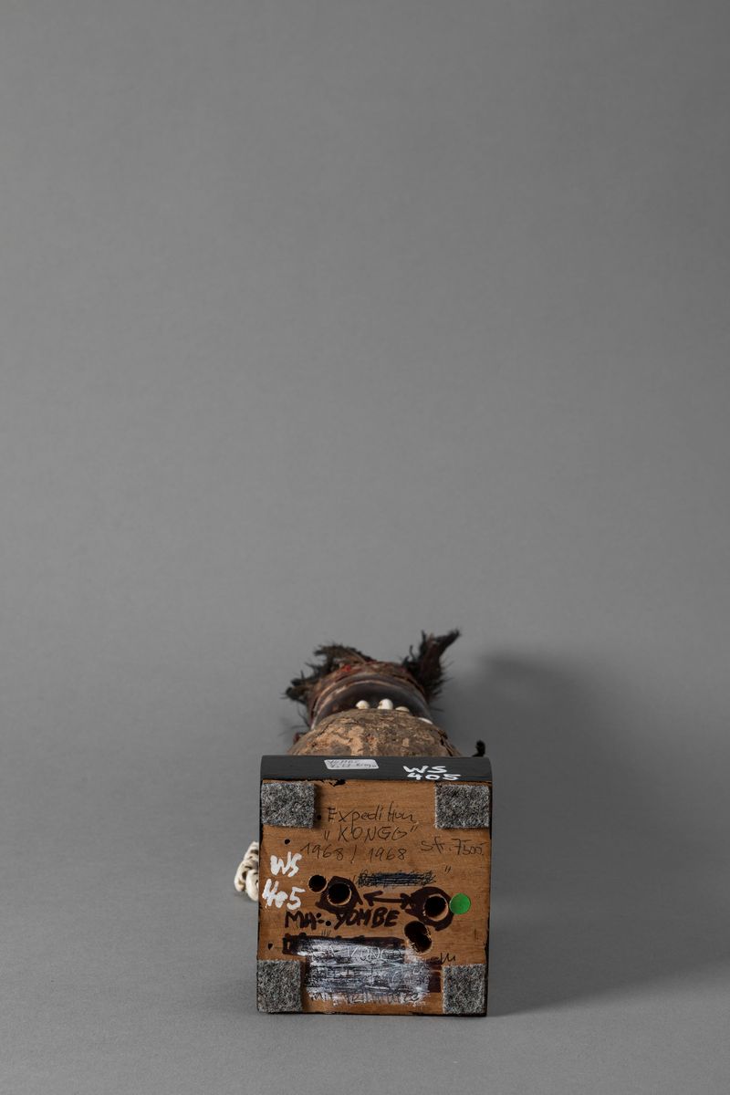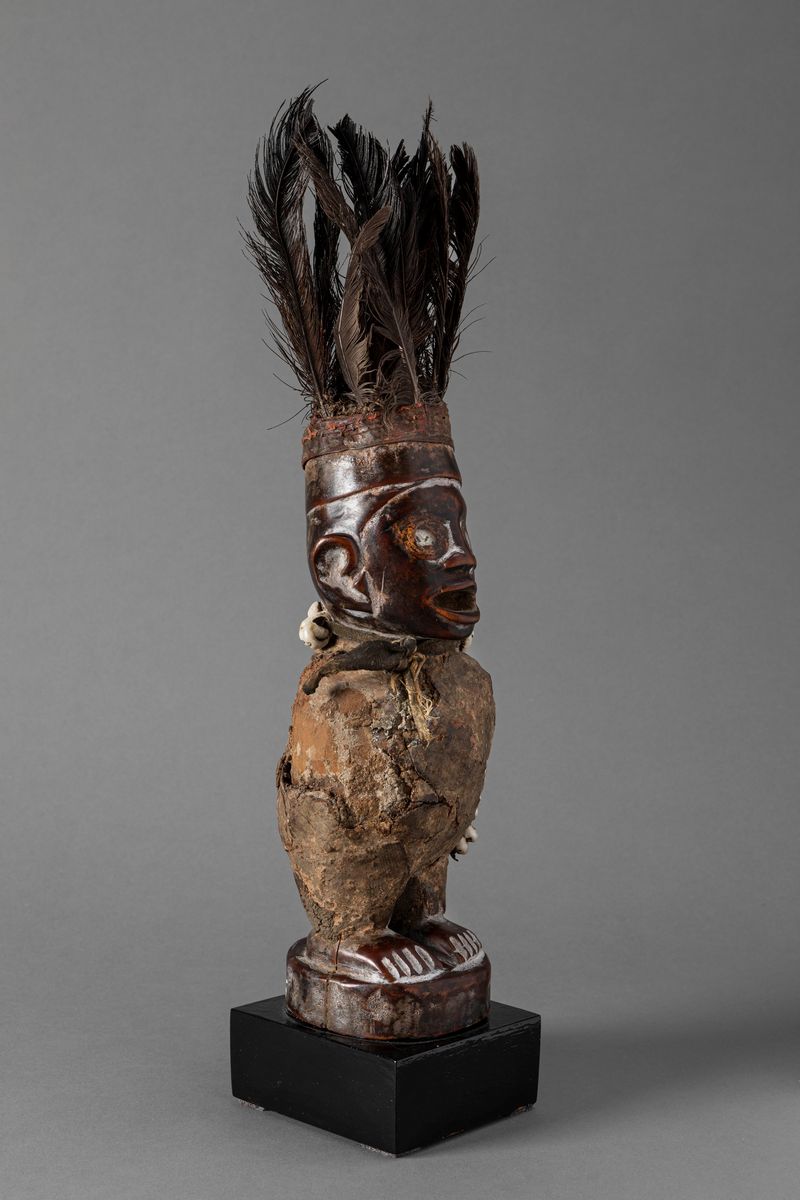 This depicts a magic figure used by a sorcier (nganga) who conducted magic, religious and divination rituals. To make the sculpture active, he would place magic substances inside the receptacles deliberately placed on the statuette’s body.The sculpture, requested by its owner, was accompanied by ritual formulas which were articulated by the sorcerer.The figure is positioned facing forwards with its body enshrouded in cloth. It is standing on a circular base. Its eyes are protected with pieces of white ceramic. The head is covered with the characteristic headdress common among the people who lived in the region. The open, toothless mouth is depicted passing a verdict, and its ears are sculptured in the shape of the number 9, following tradition.