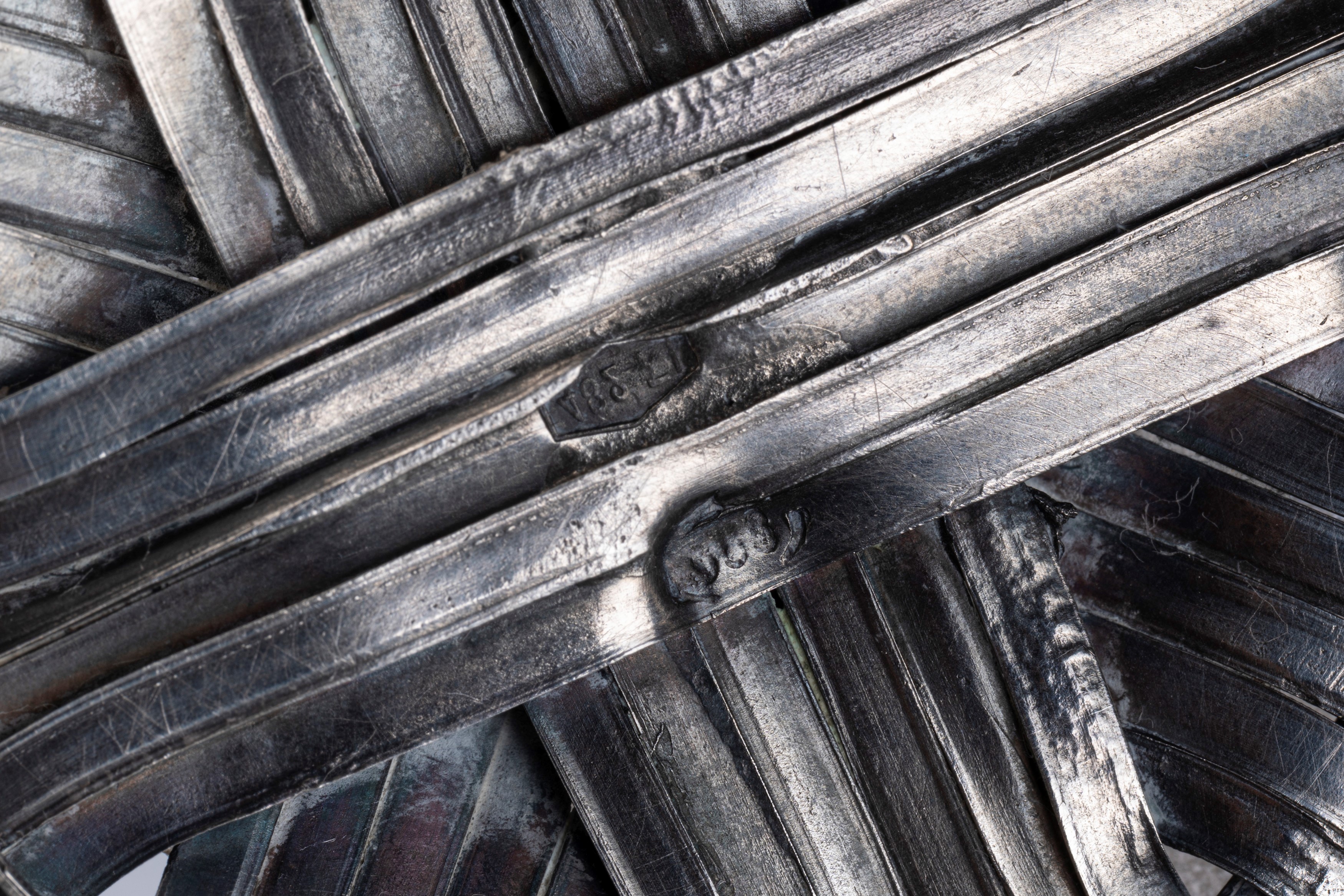 in silverwith a body made of woven mesh resting on a circular base and curved handle.