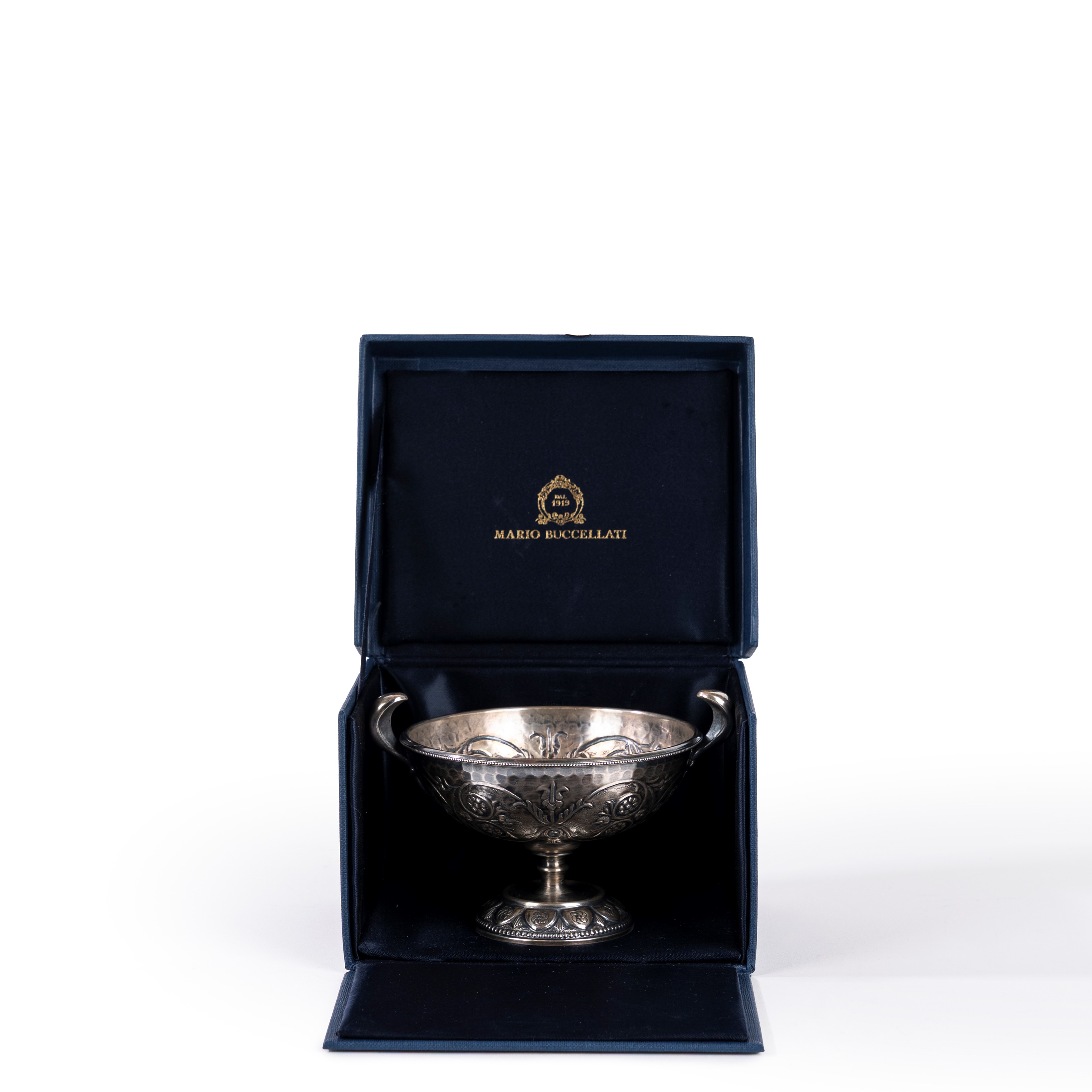 in 925 silverbody entirely decorated with branches with stylised flowers, circular base with chain decoration, curved lateral handles, signed Mario Buccellati, 15MI, 925, in original box.