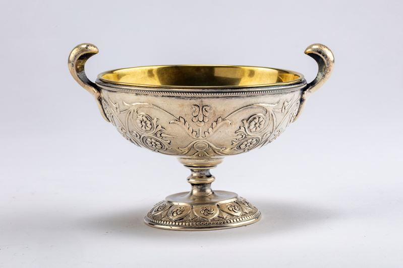 with gilded internal cup, body entirely decorated with branches with stylised flowers, circular base with chain decoration, curved lateral handles, signed Buccellati, 925.