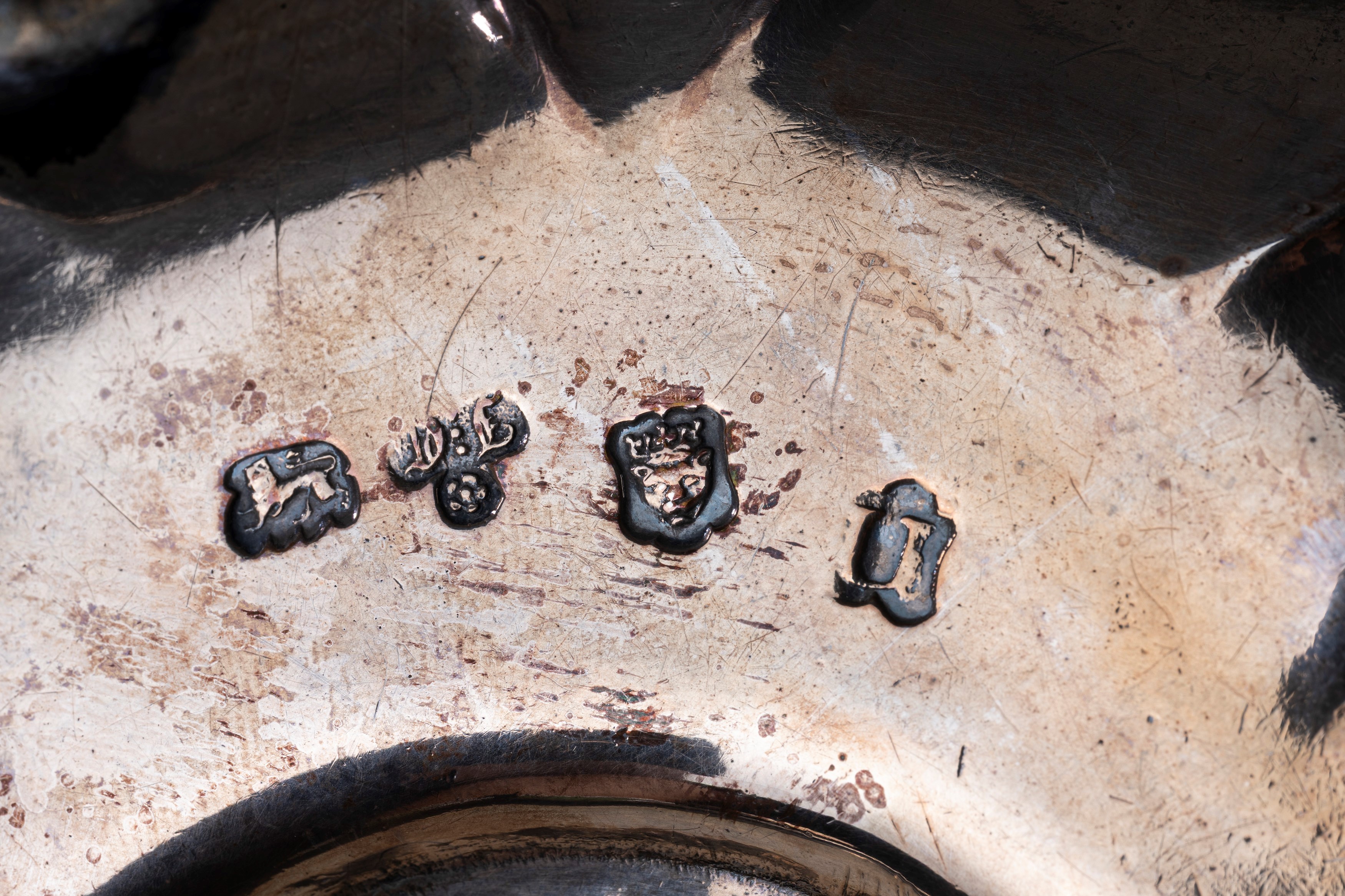 with a chiseled, shaped circular base, supported by three feet, a turned central candle holder, and a heraldic coat of arms engraved on the front.