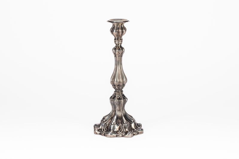 in silverwith a single flame, with a fluted shaft and a ribbed embossed base.