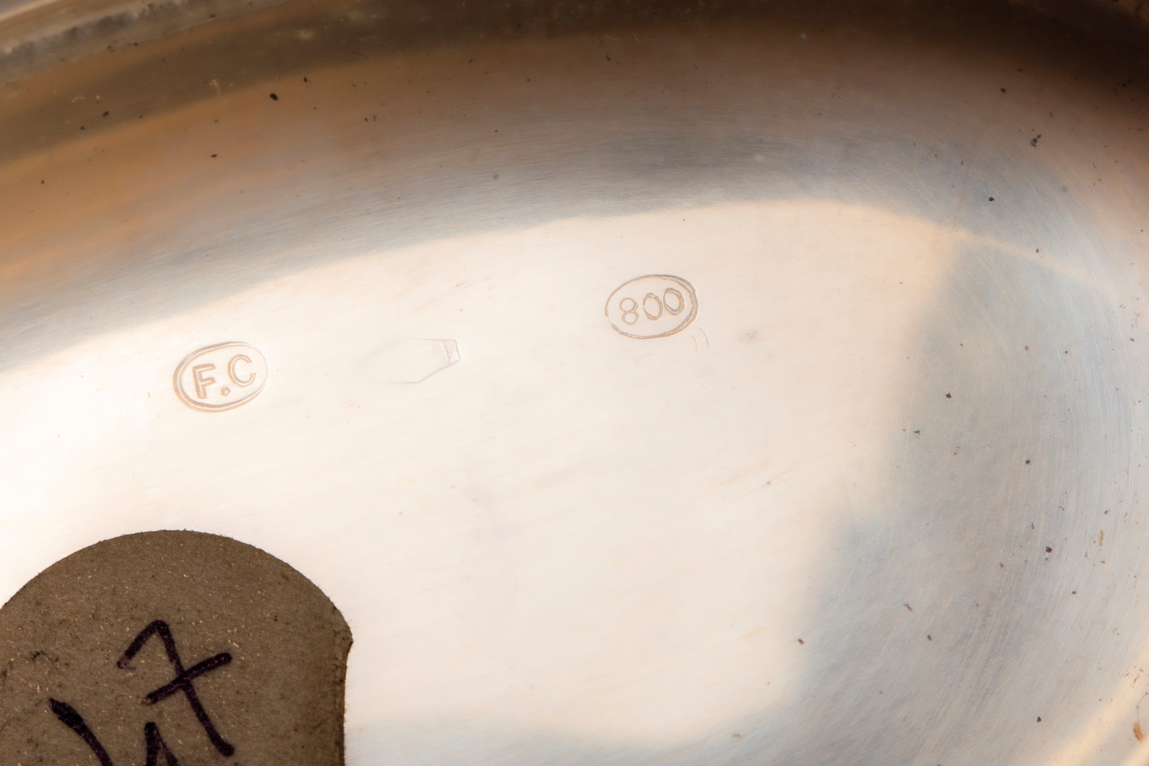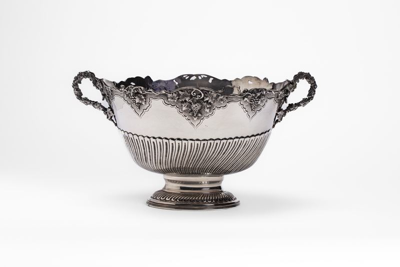 in silvertwo-handled, with an upper band chiseled with vine and grape shoots, wavy handles, lower part embossed with altered decorative motifs resting on an oval foot.