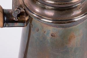 with a smooth truncated cone-shaped body, shaped spout, domed lid with turned grip and shaped wooden handle.