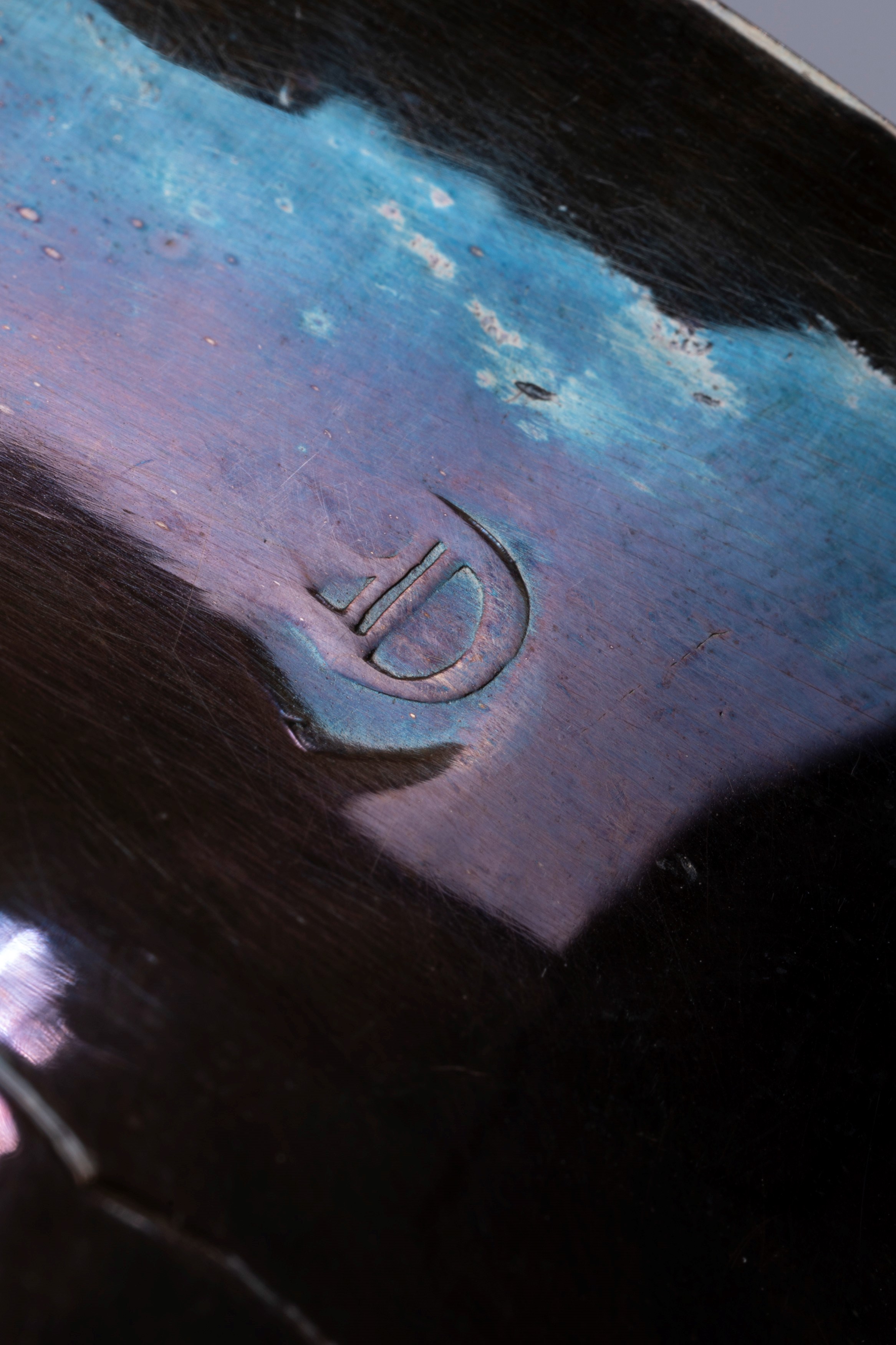 with two curved lateral handles, front with engraved heraldic coat of arms. (Slight defects).