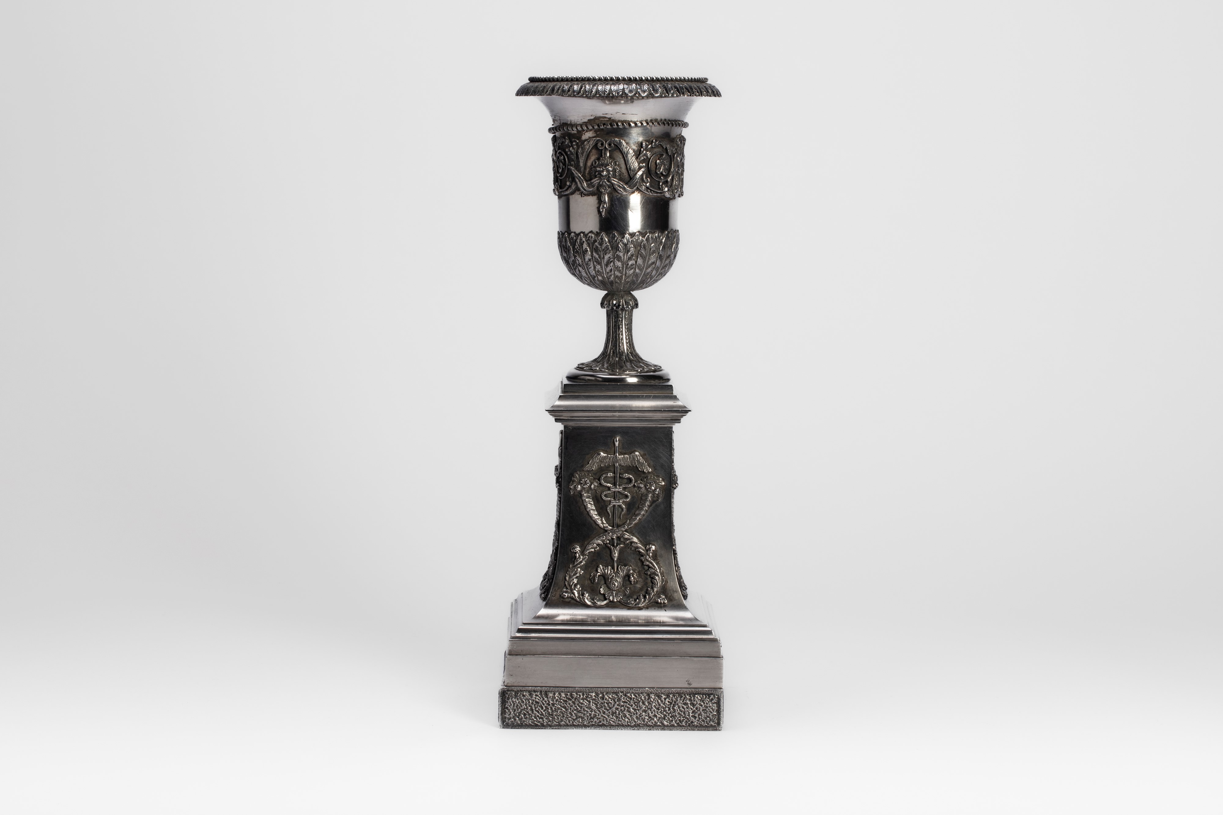 in silverwith decorated and finely chased body, central band with Neoclassical-style ornaments, upper rim adorned with a foliate motif, and stepped base with applied decorations.