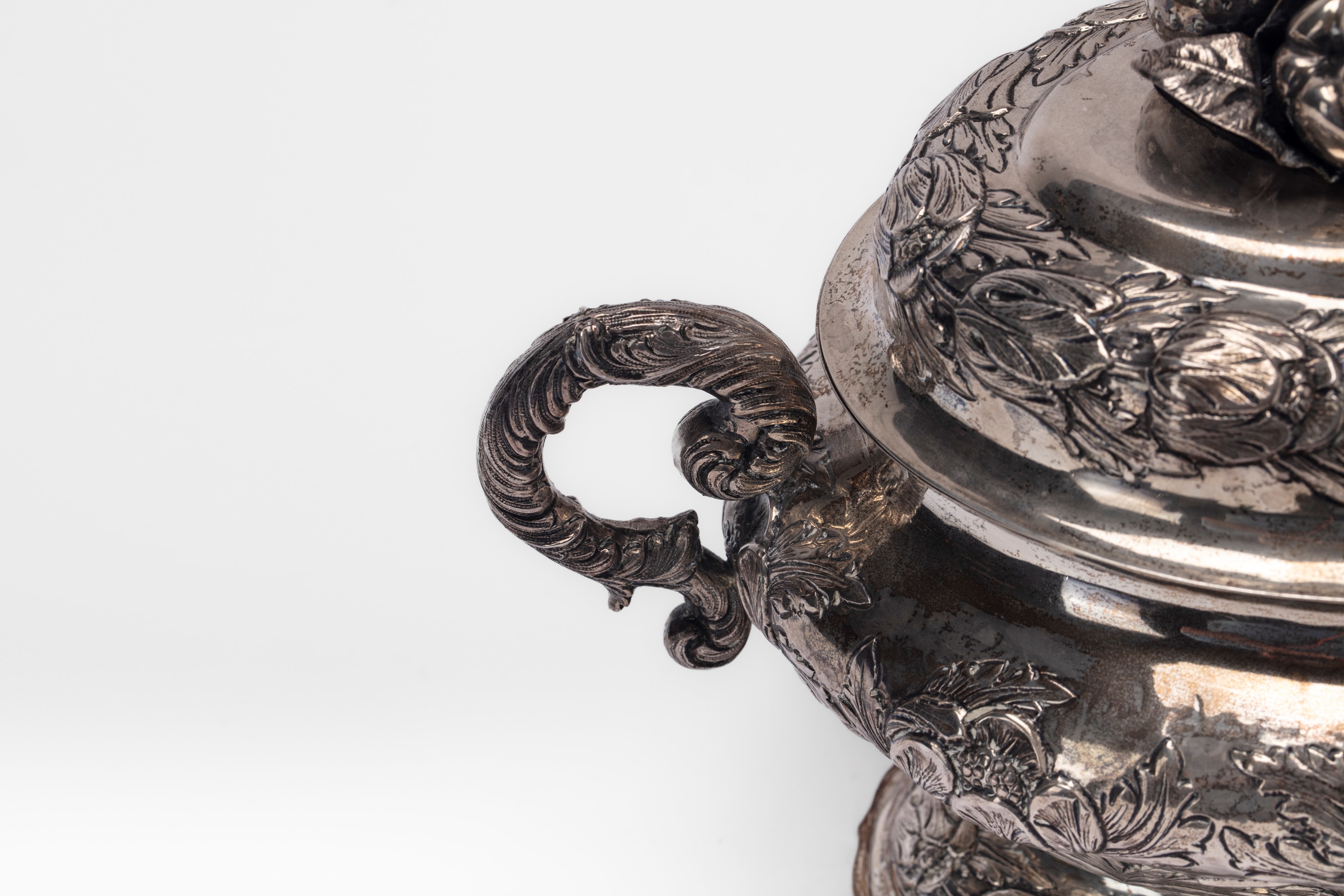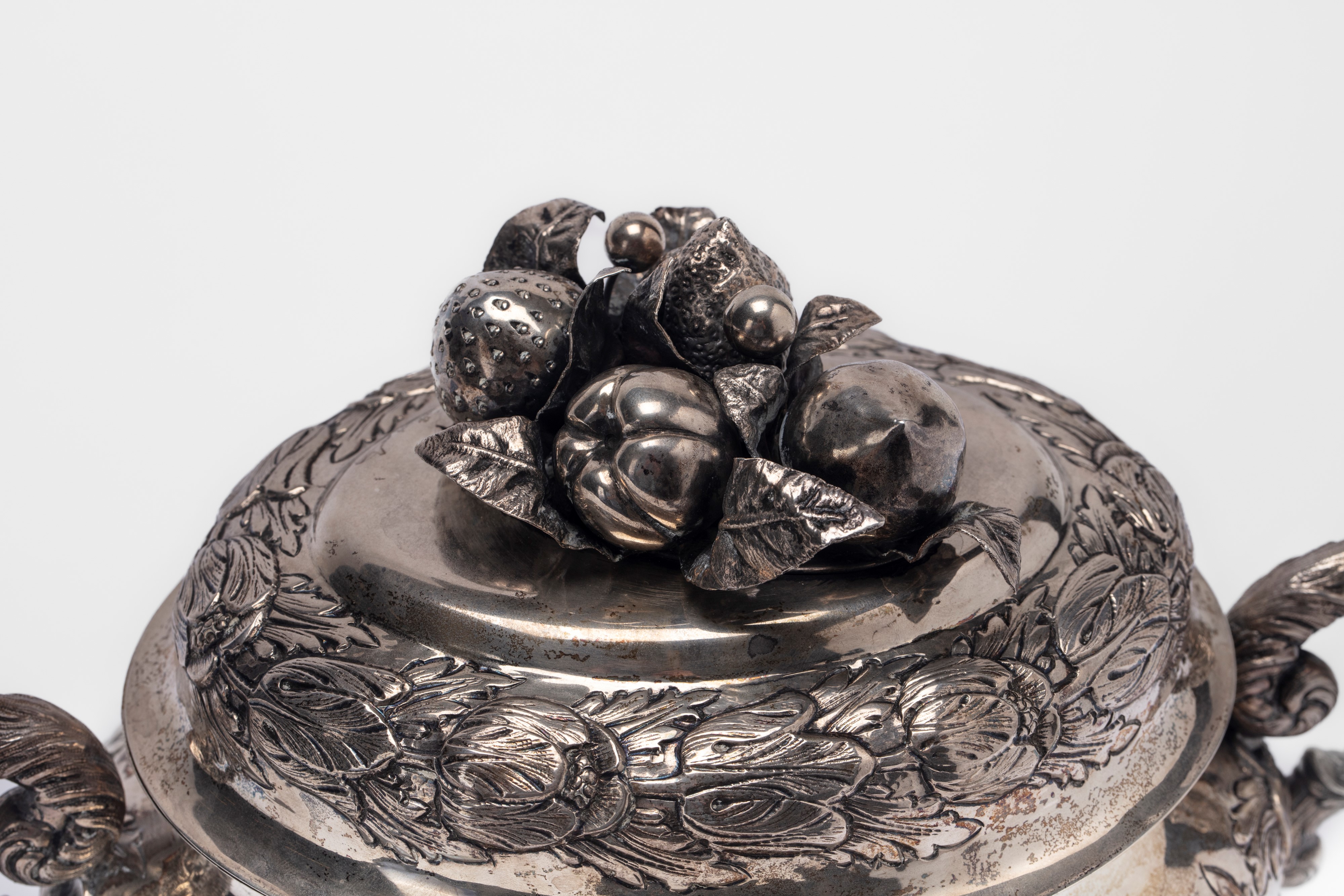 in silver and vermeiltwo-handled, oval-shaped body richly embossed with floral motifs and linked leaf motifs, curved handles, lid decorated with fruit and leaves chiseled in the round, vermeil interior.