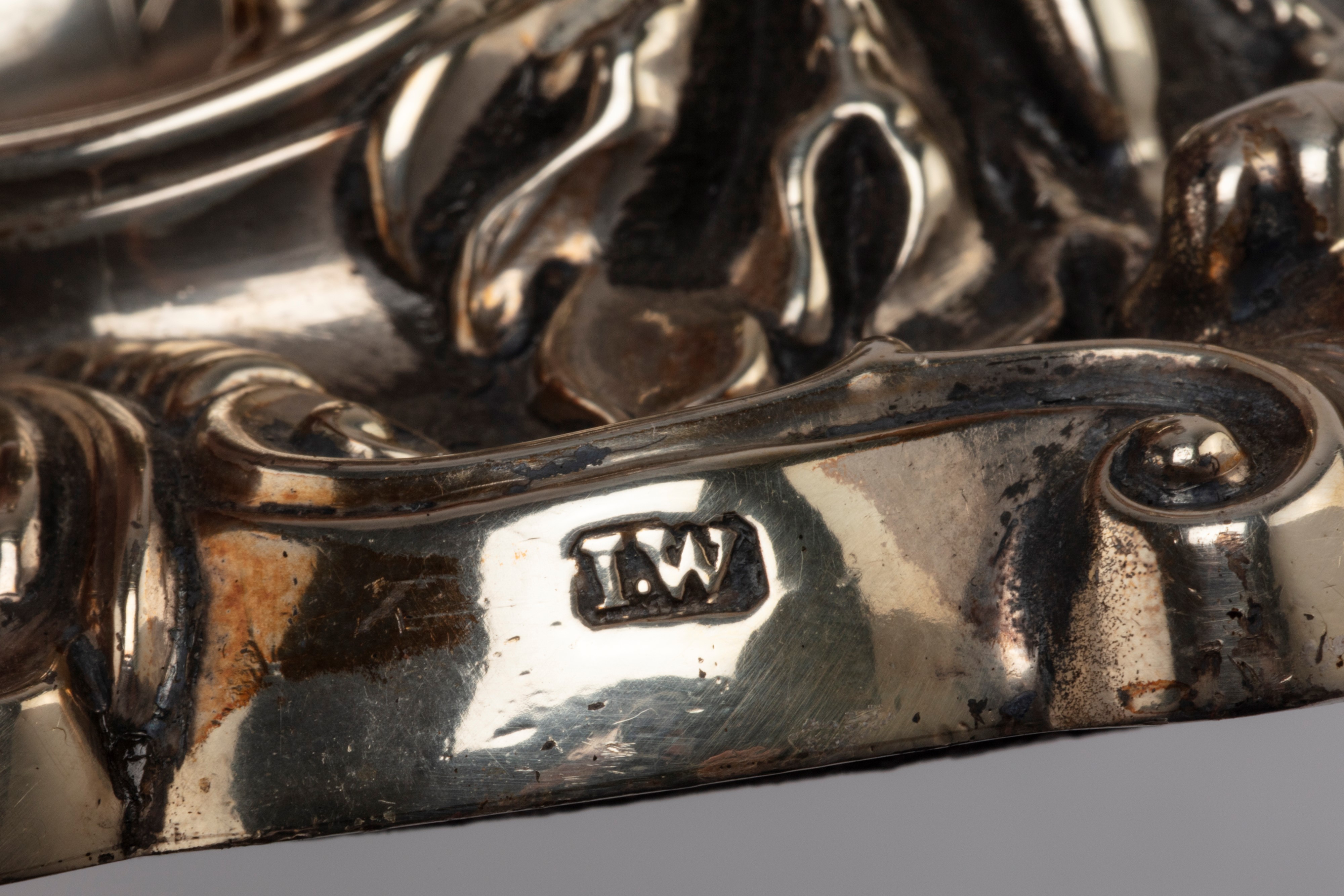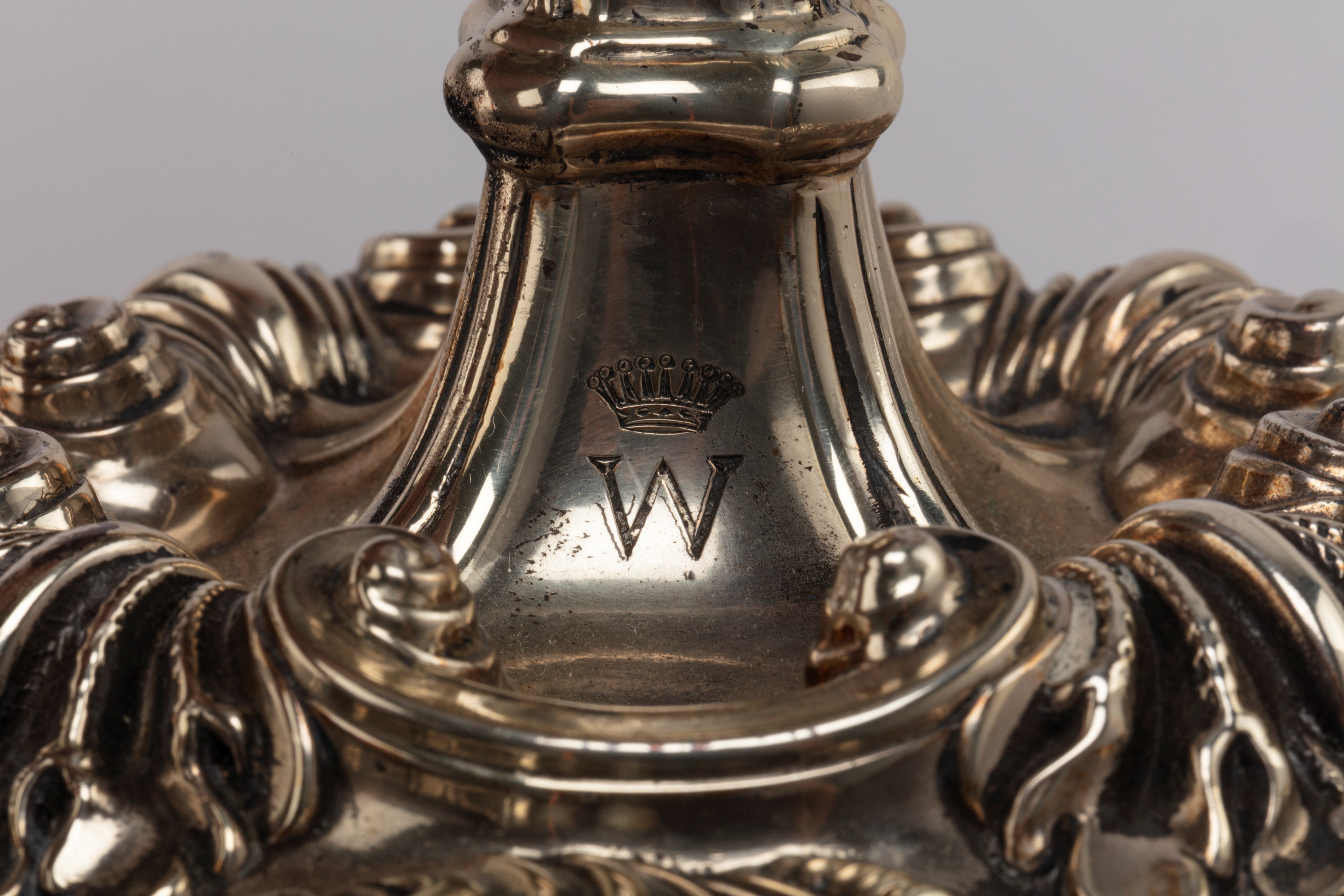 single-flame, Rococo style with stem and base chiseled with scrolls and leaves, engraved initial "W" with a crown.