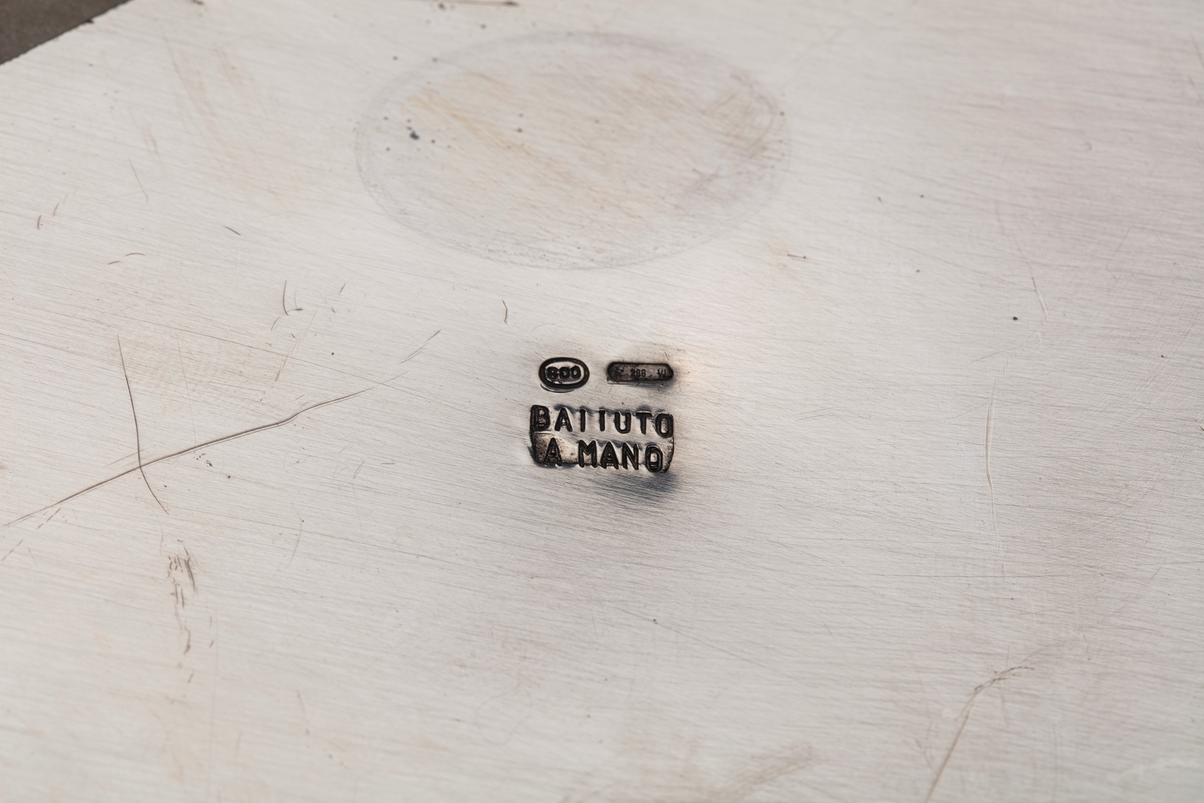 in silverbody decorated with light hammering and embossed, with a curved spout and shaped grip, with turned wooden handle and knob.