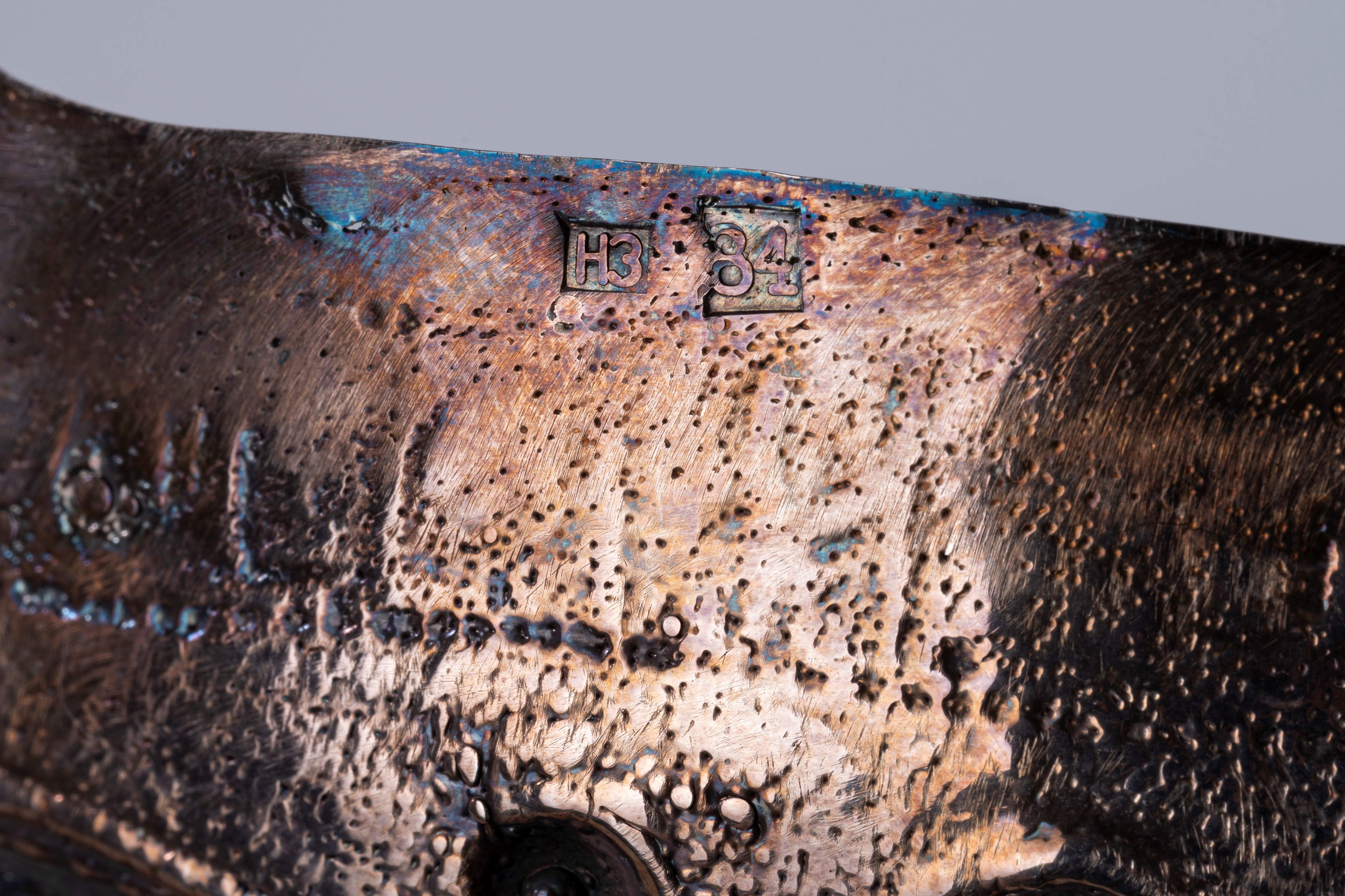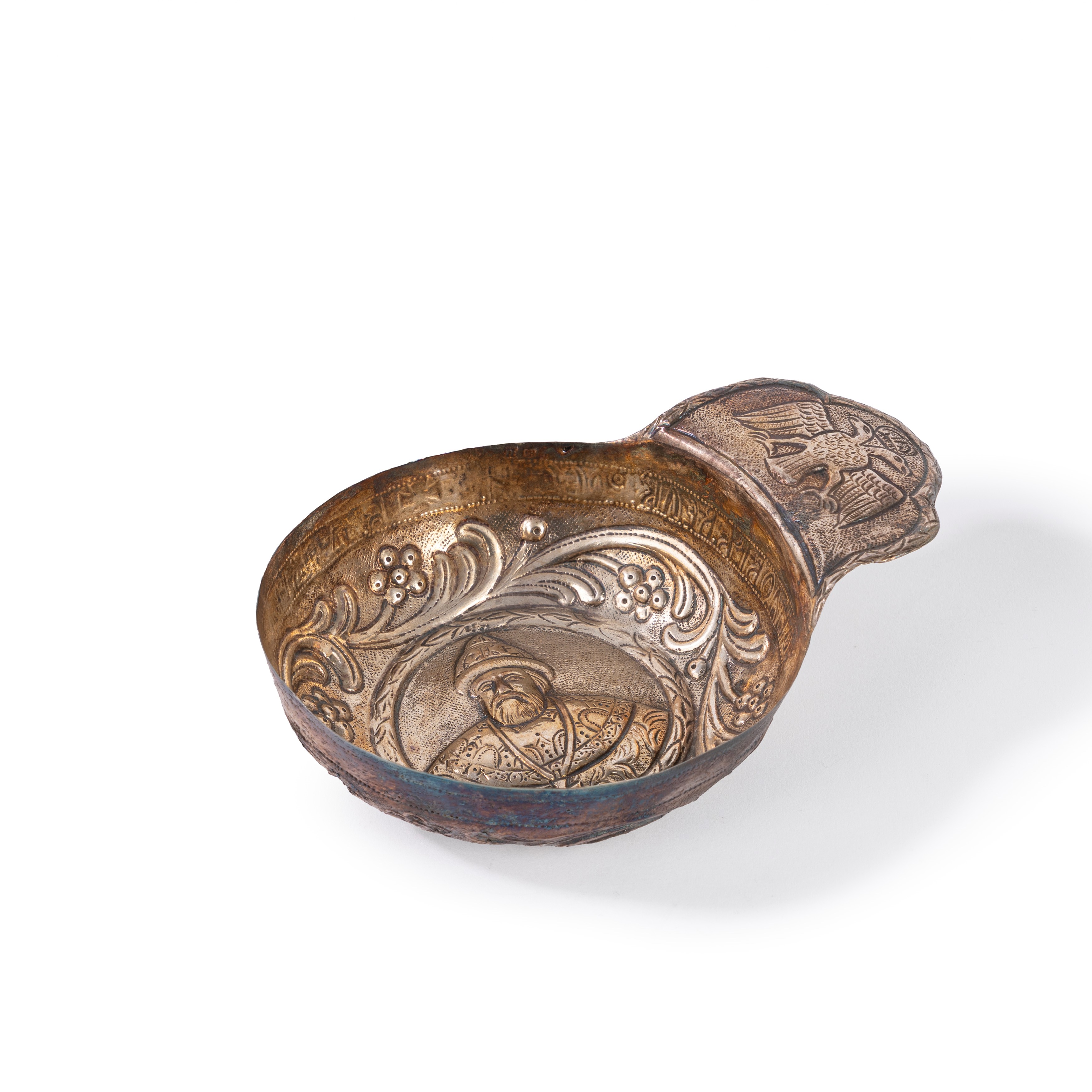 in silverround in shape, with a socket embossed with the portrait of Tsar Alexei Mikhailovich Romanov and a grip decorated with a double-headed eagle. (Slight defects).