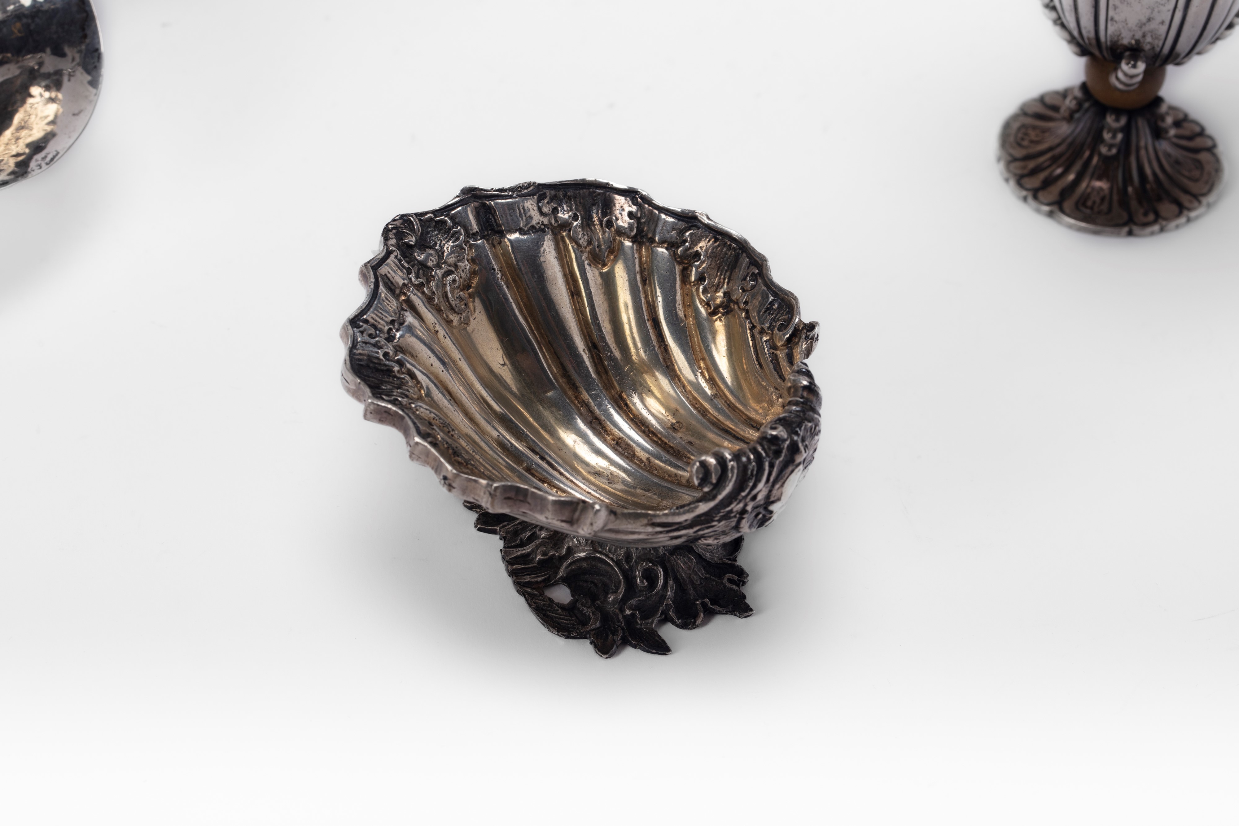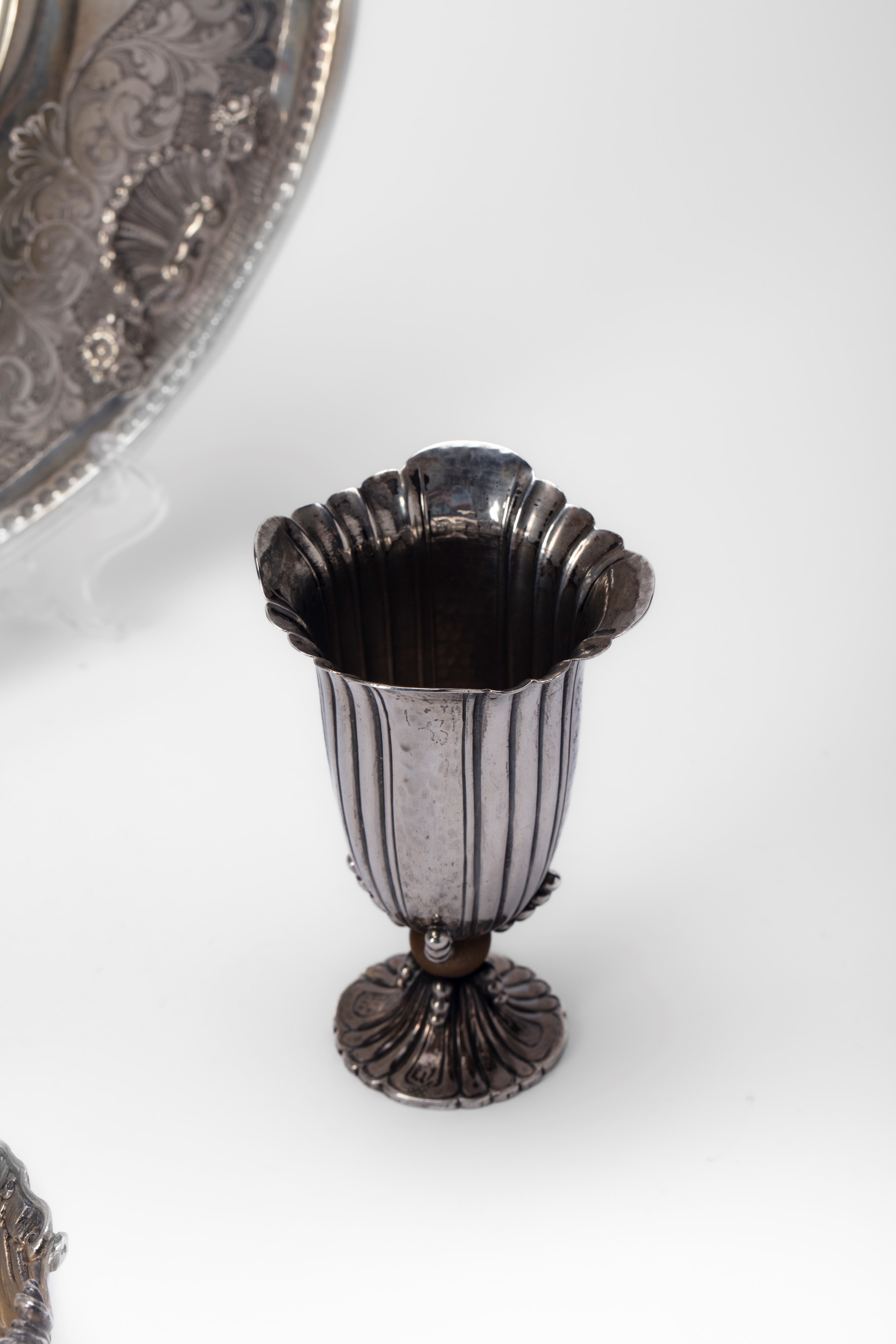 in silverof different decoration, composed of a plate with an embossed edge with scrolls and shells, a small basket, a fluted vase and a chiseled shell-valve stand. (Slight defects).