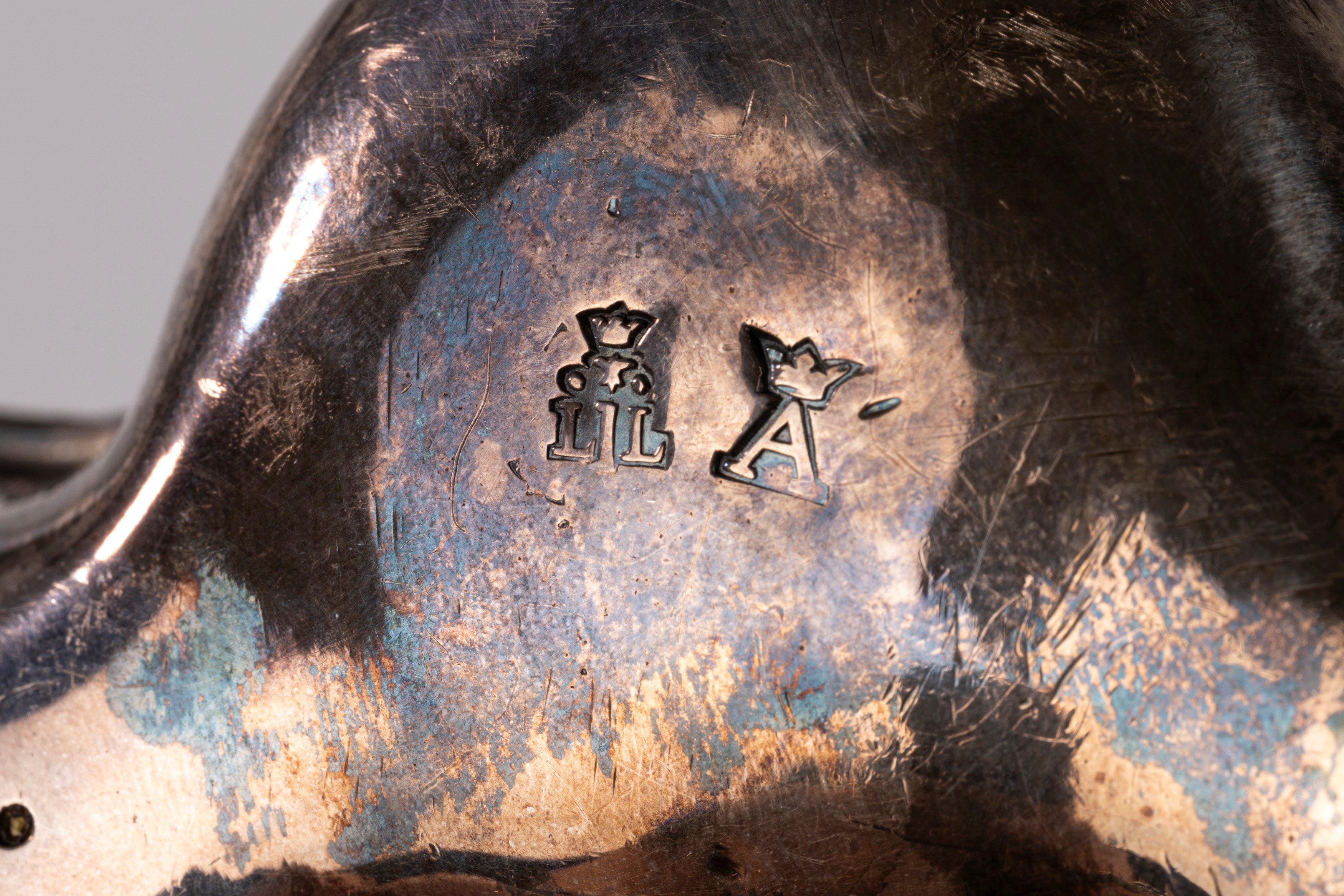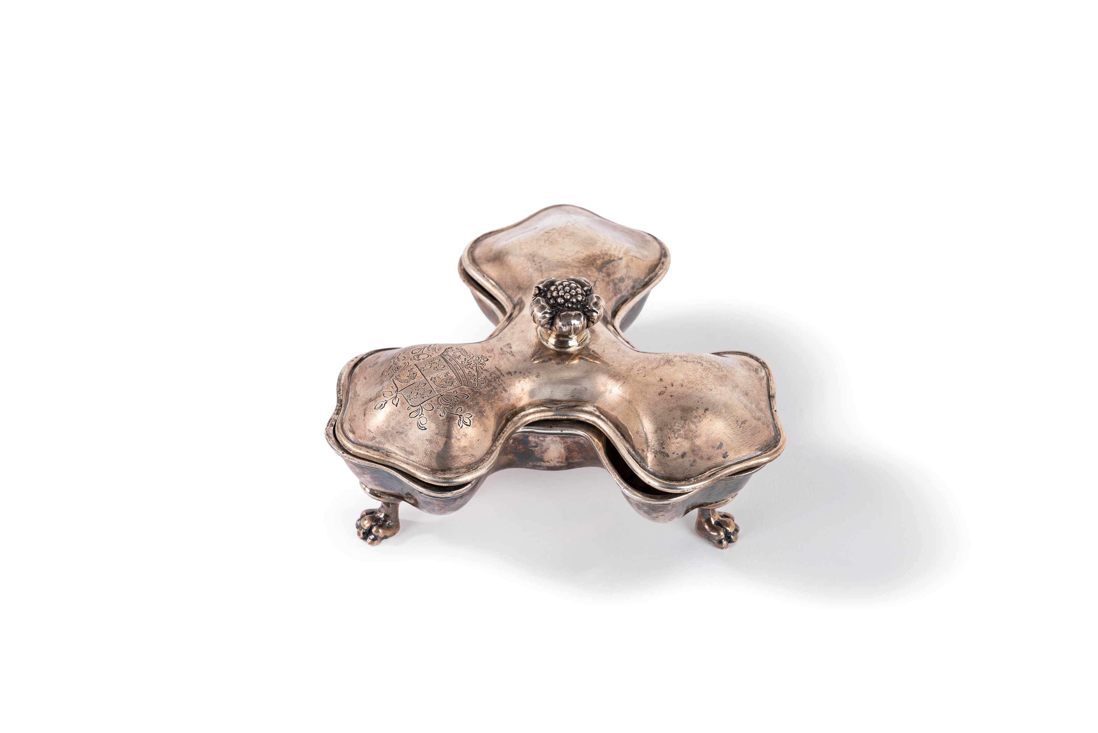 in silvertrilobate shape with embossed body supported by three chiseled feet in the shape of a feline paw, lid with a round floral grip and engraved heraldic coat of arms.
