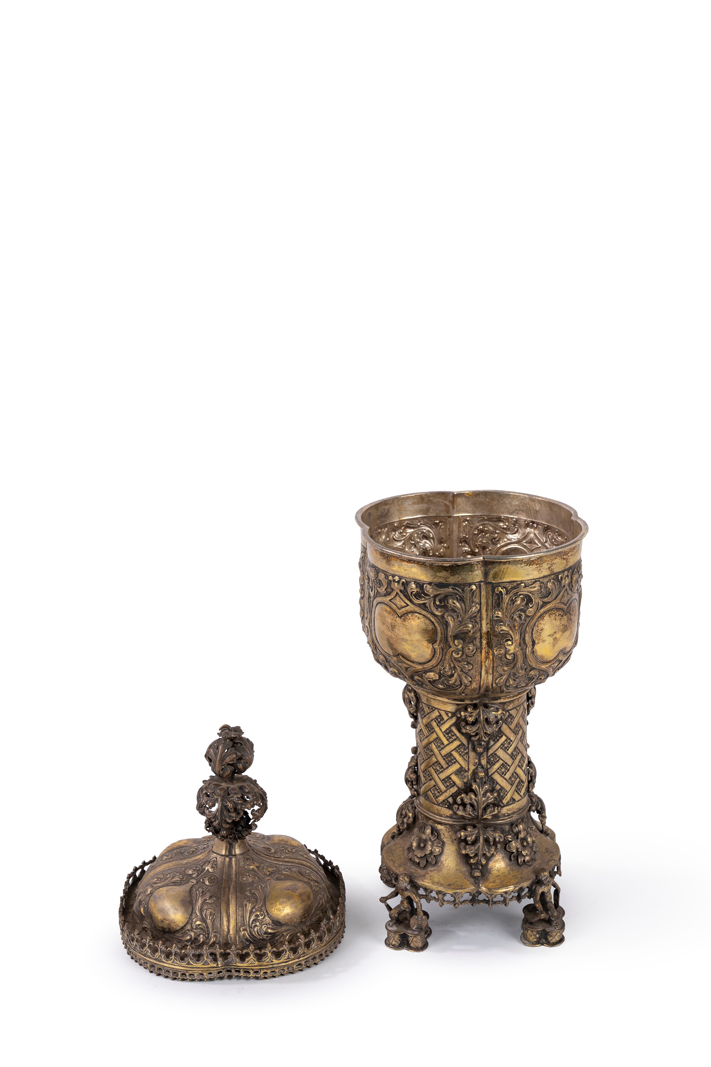 in lightly gilded silverupper part with lid decorated with a central pinnacle with an embossed body with rustication and leaf motifs, central part with interwoven geometric decoration, base supported by four figurines chiseled in the round, 17th century imitation stamps at the base.