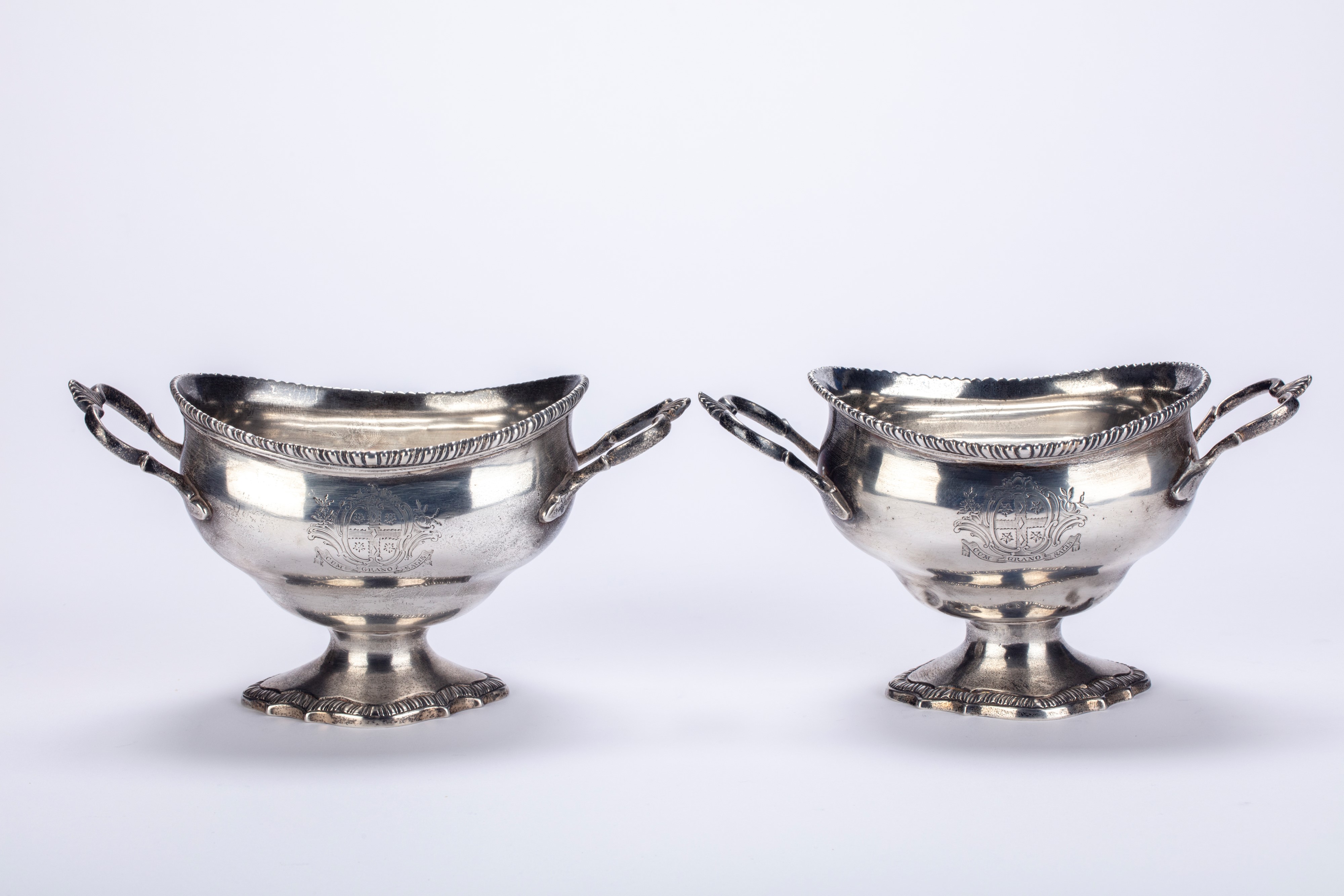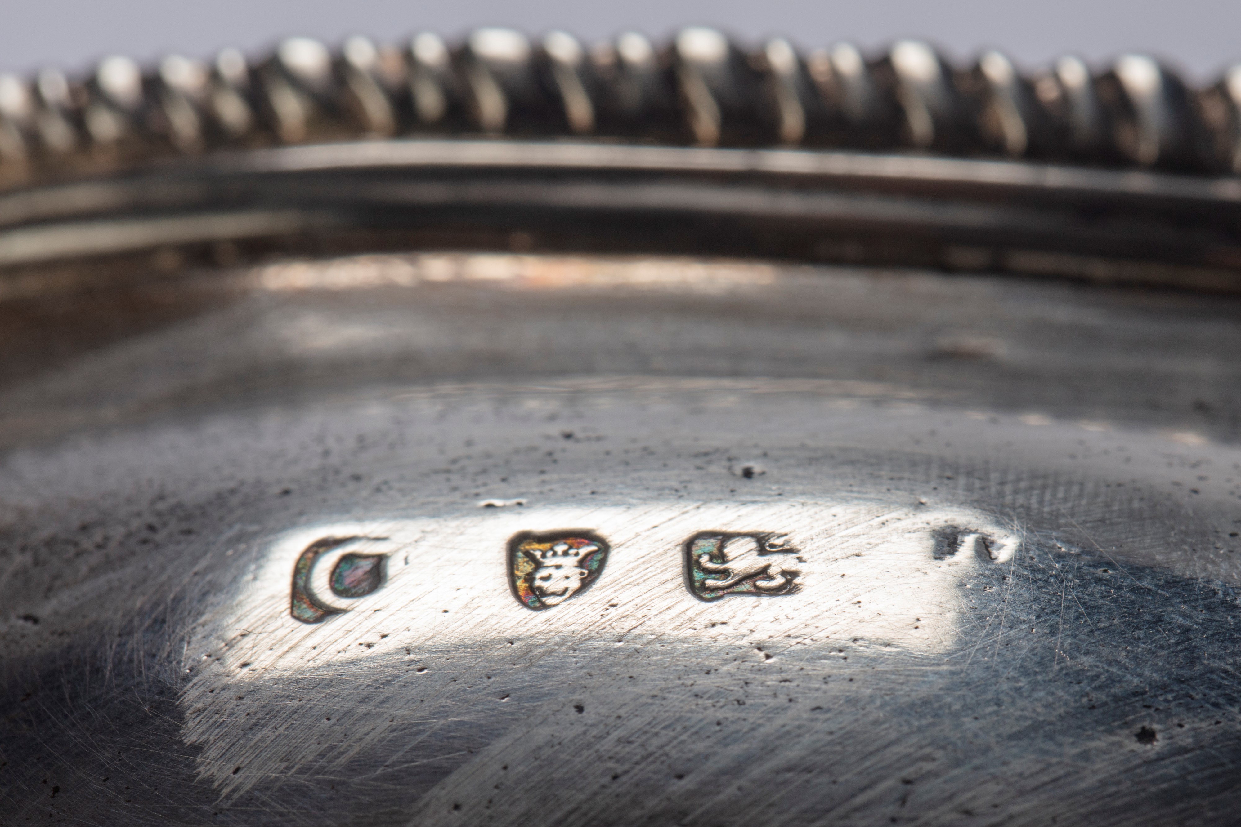 in silverresting on a shaped base, oval body with engravings of stylised plant motifs and cartouche with motto. (Defects).