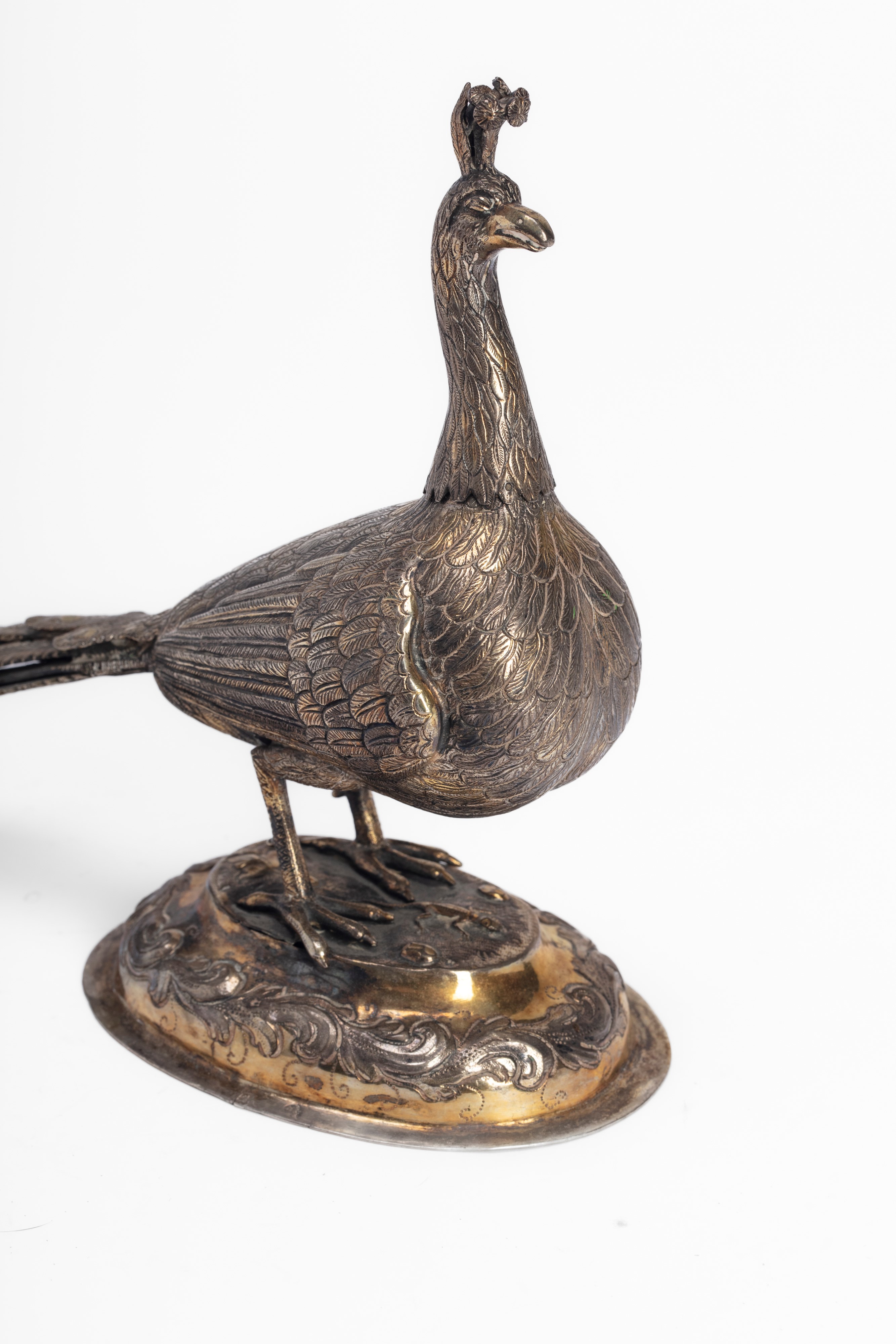 in silverfully in the round, with body finely chased to simulate plumage. Base chased with volutes.