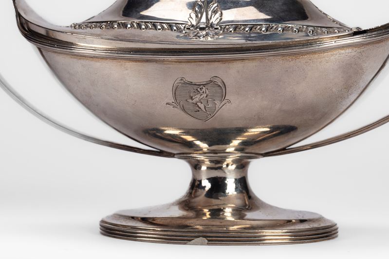 with an elongated oval body, lids embossed with linked motifs and leaves, smooth body with a coat of arms and heraldic triumph with motto in the centre on both sides.