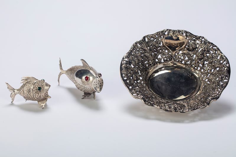 in silver and silver-plated metalfish-shaped, perforated basket in silver-plated metal.