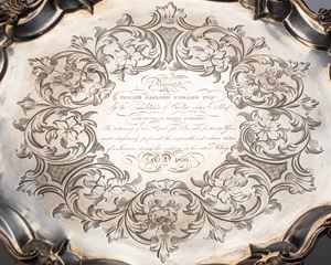 with shaped and chiseled edge with stylised shells, hollow engraved with floral racemes and dedication in the centre, chiseled feet.
