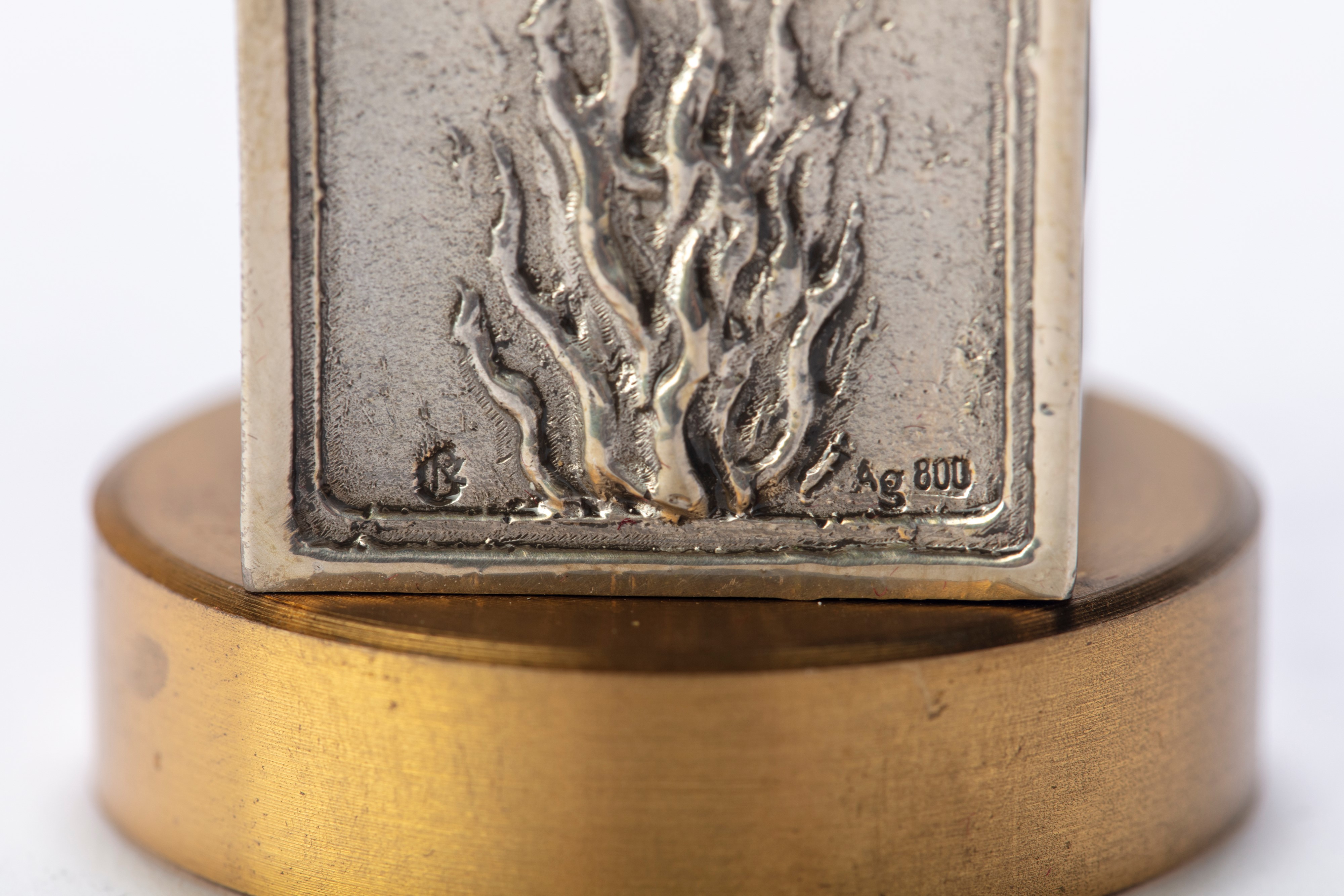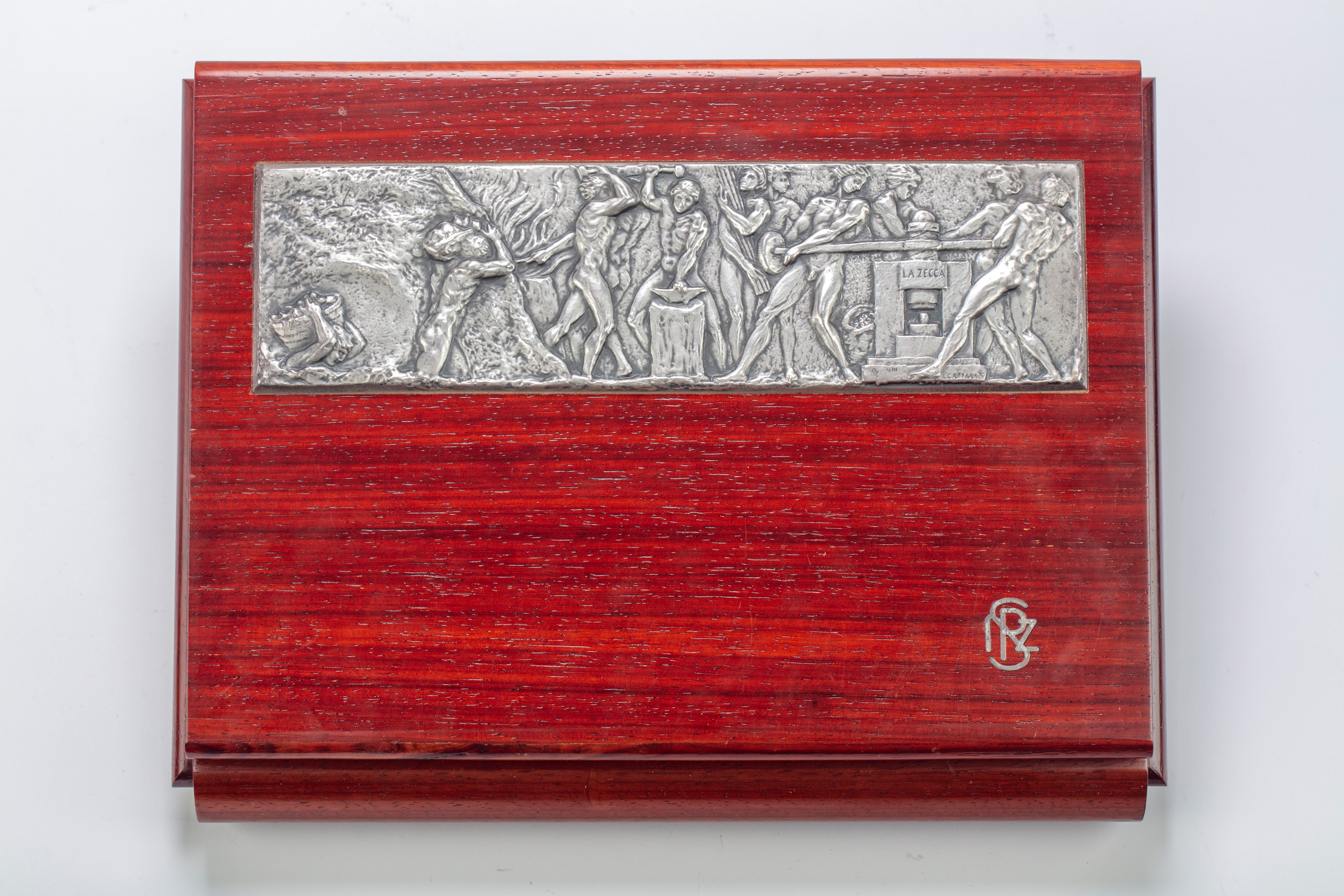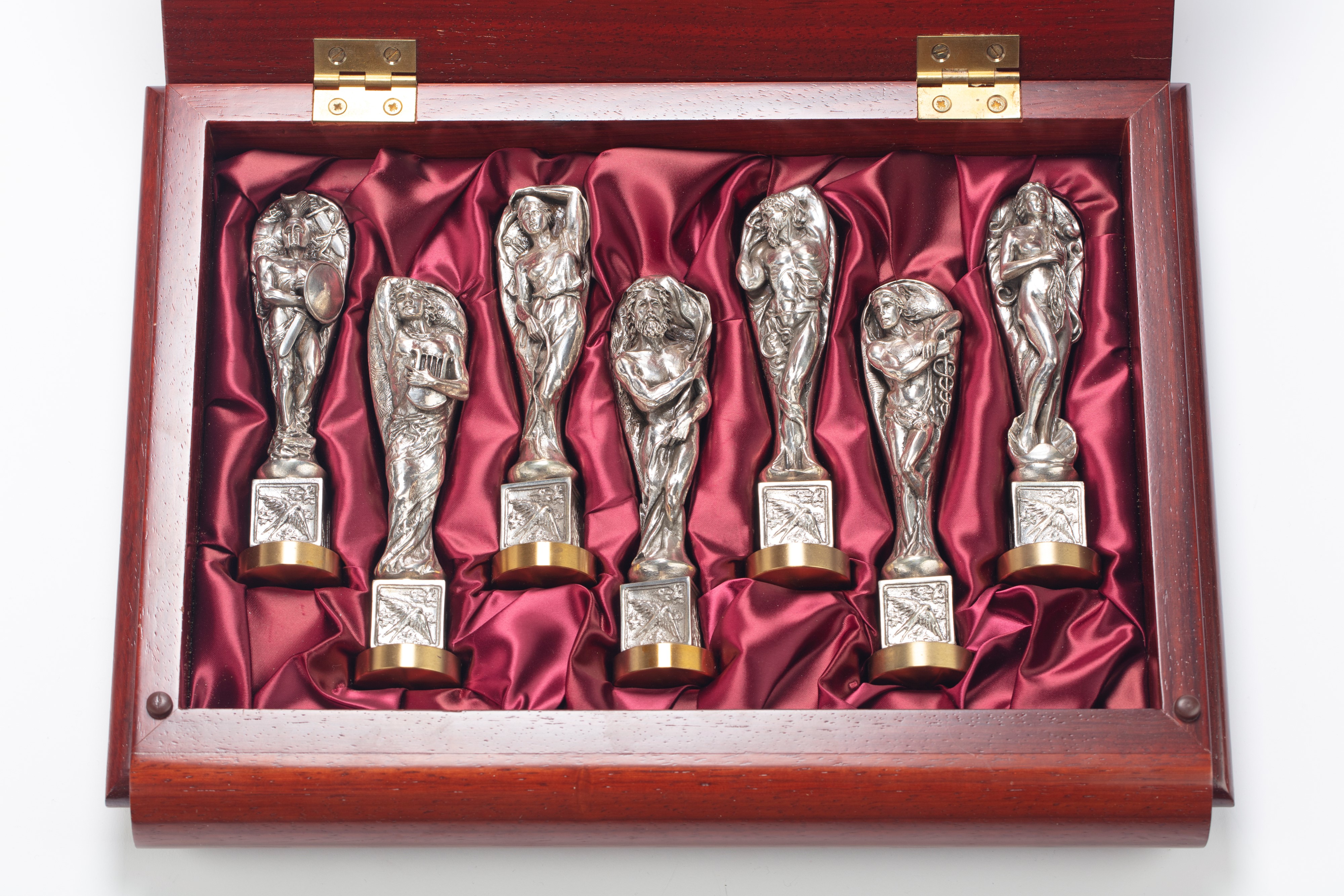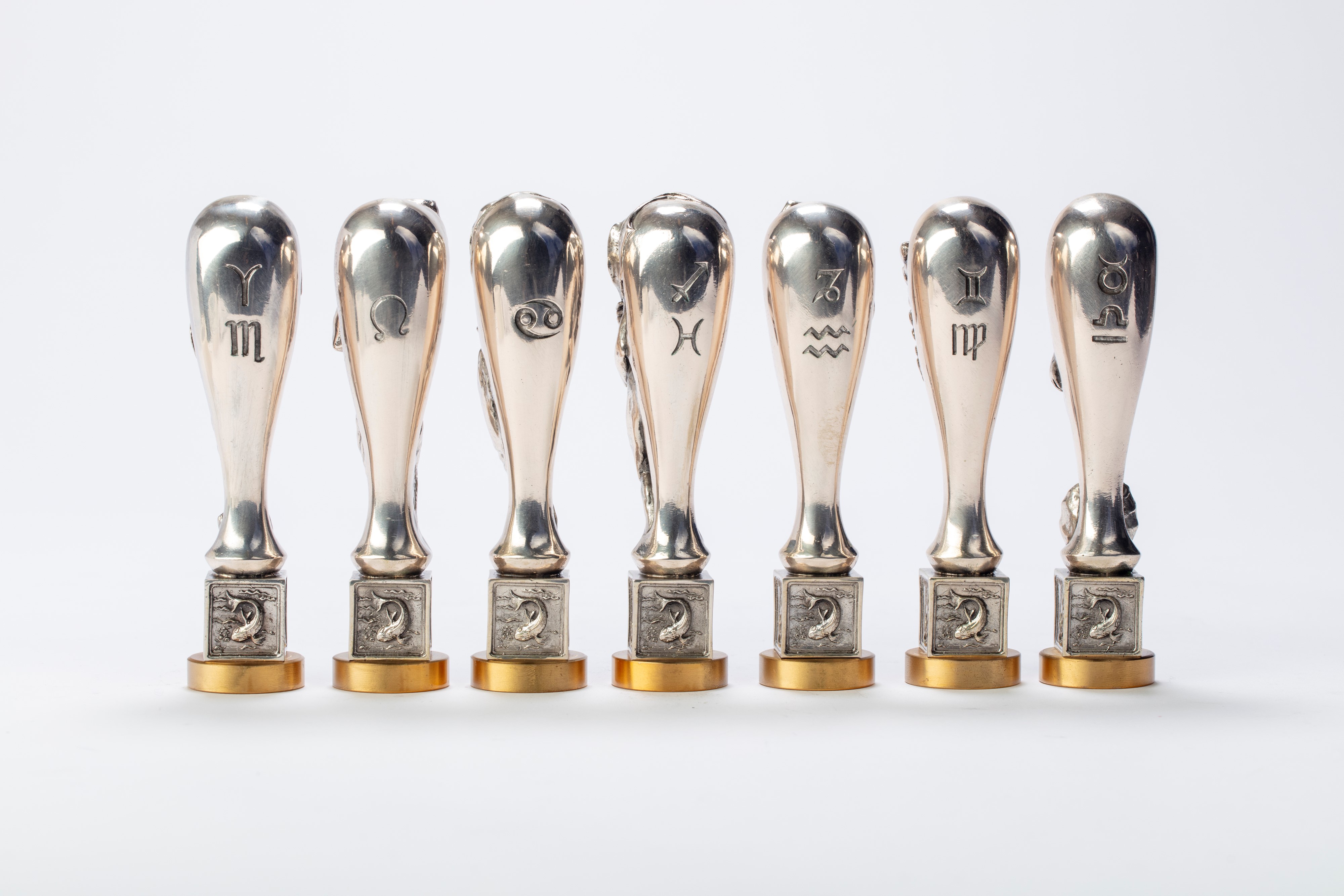 in silvereach seal hand-chiseled in the round with mythological figures resting on square bases chiseled with symbols, removable bronze lower part for sealing, with original box.
