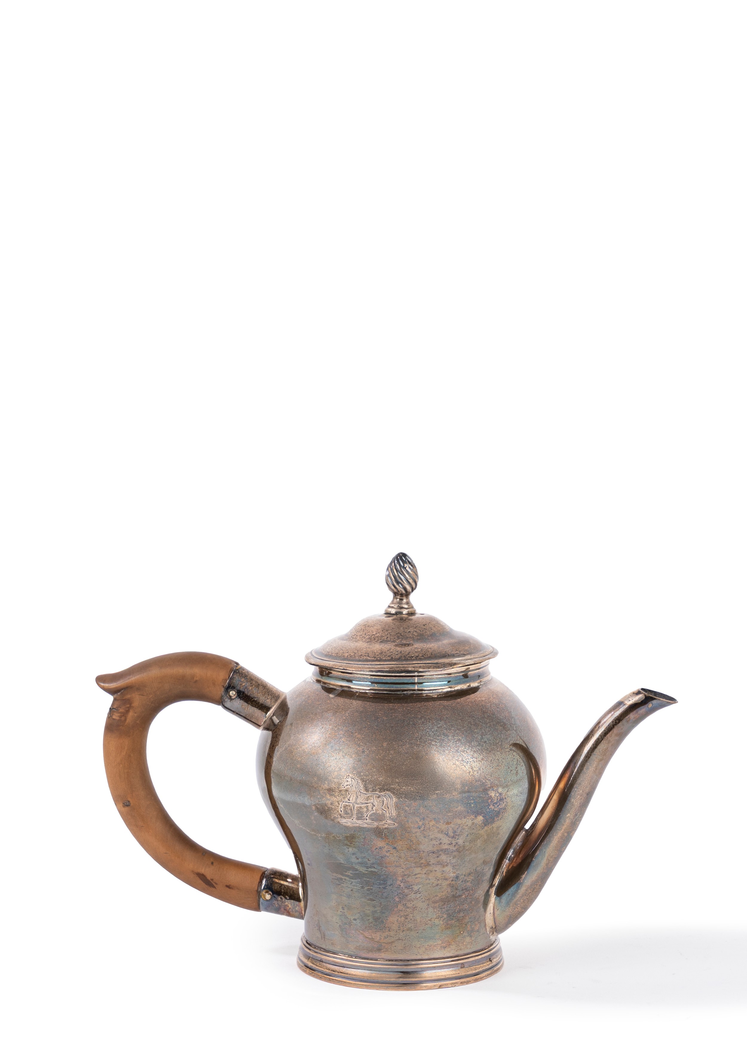 with lid, pear-shaped body with engraved heraldic coat of arms and stylised horse, wooden handle, wavy spout.