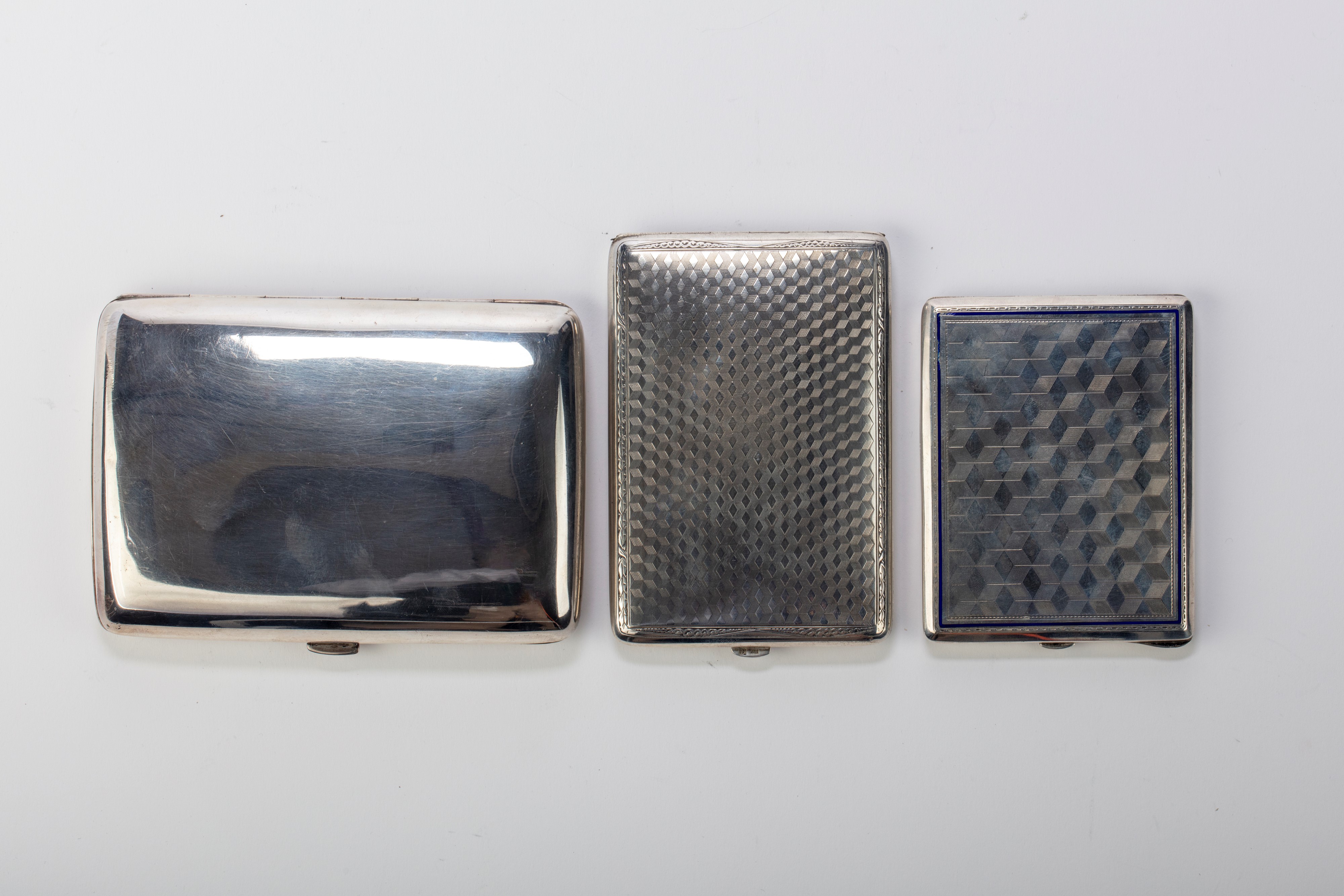 in silvertwo with engraved bodies with geometric motifs and one with a smooth body.