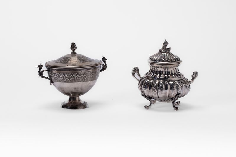 in silverof different decorations, one with a body finely engraved with ribbons and floral garlands, one with an embossed body engraved with scrolls.