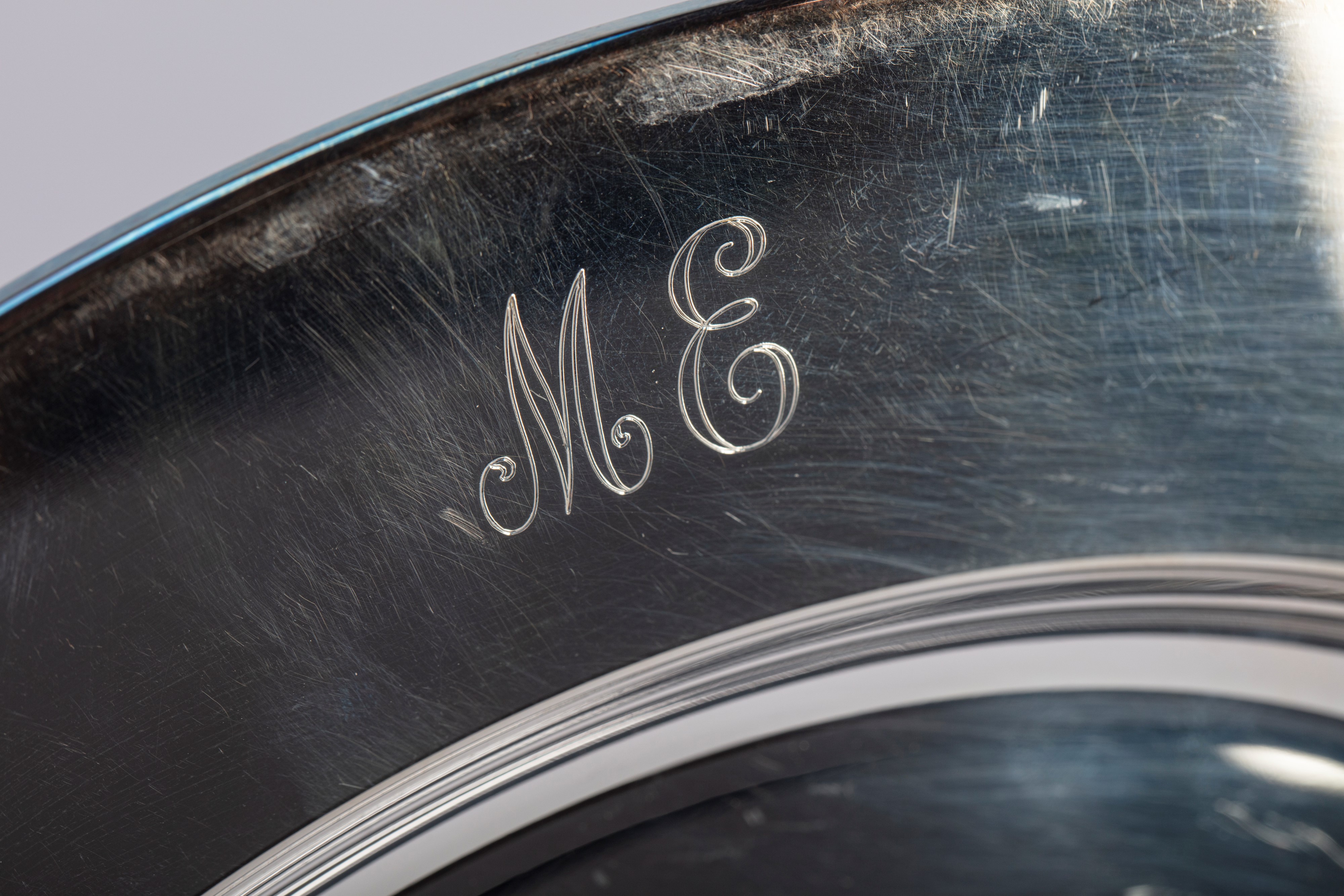 with smooth band and cord, with engraved “ME” initials.