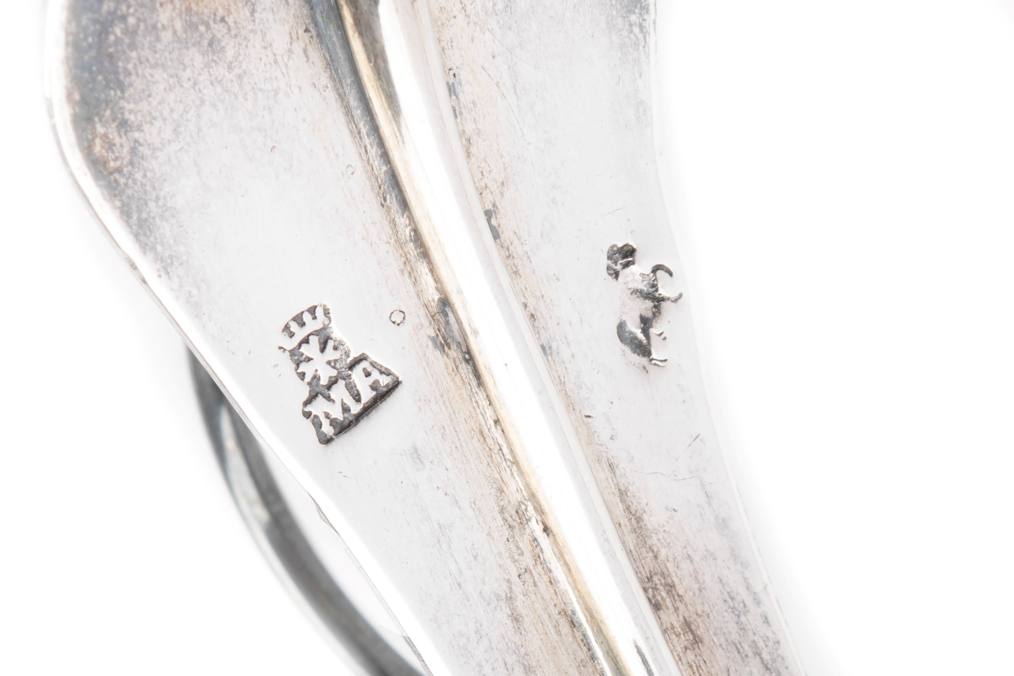 in silverthe lie embossed with a torchon motif, the sugar bowl embossed and chiseled, with a pine cone grip, on a tripod.