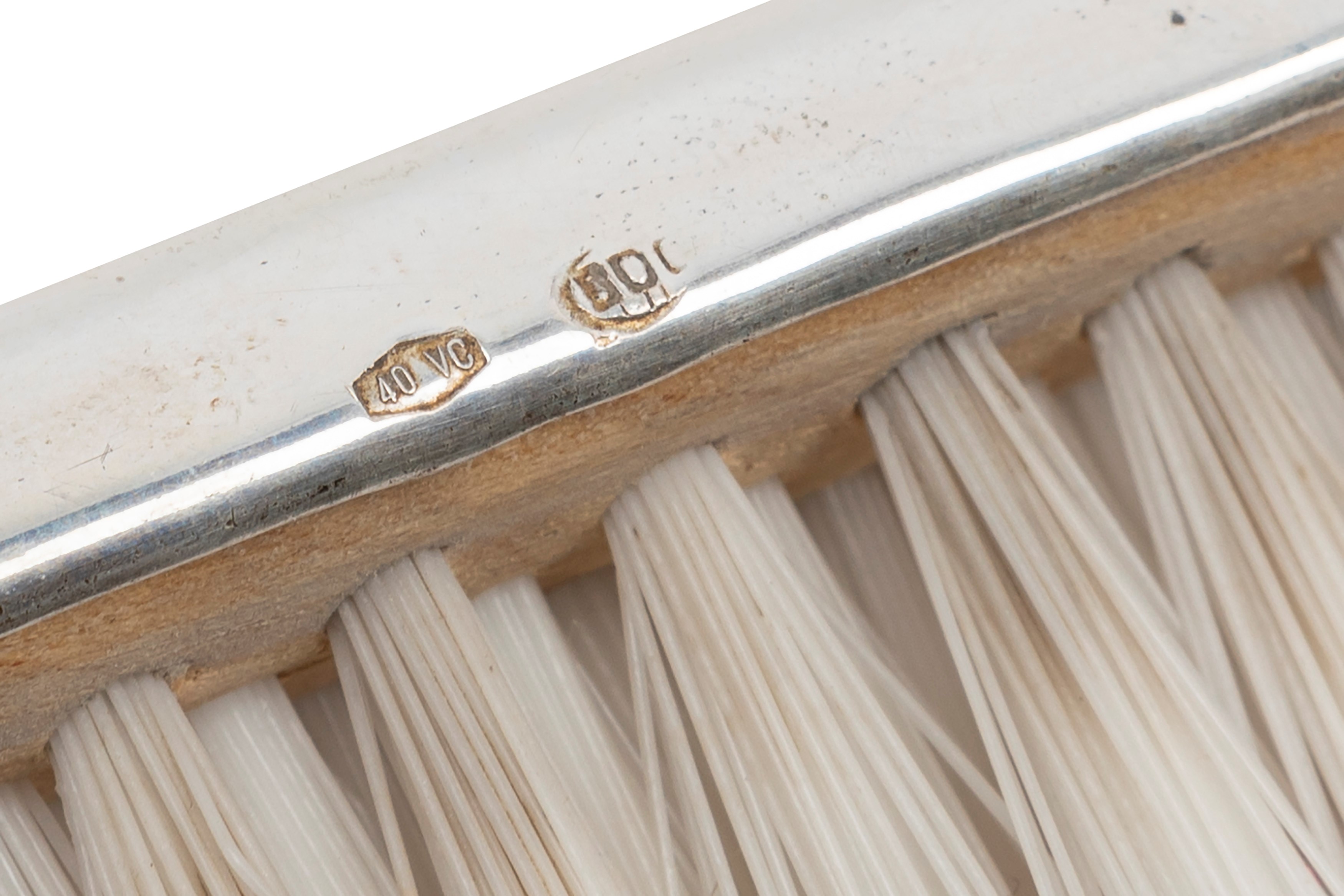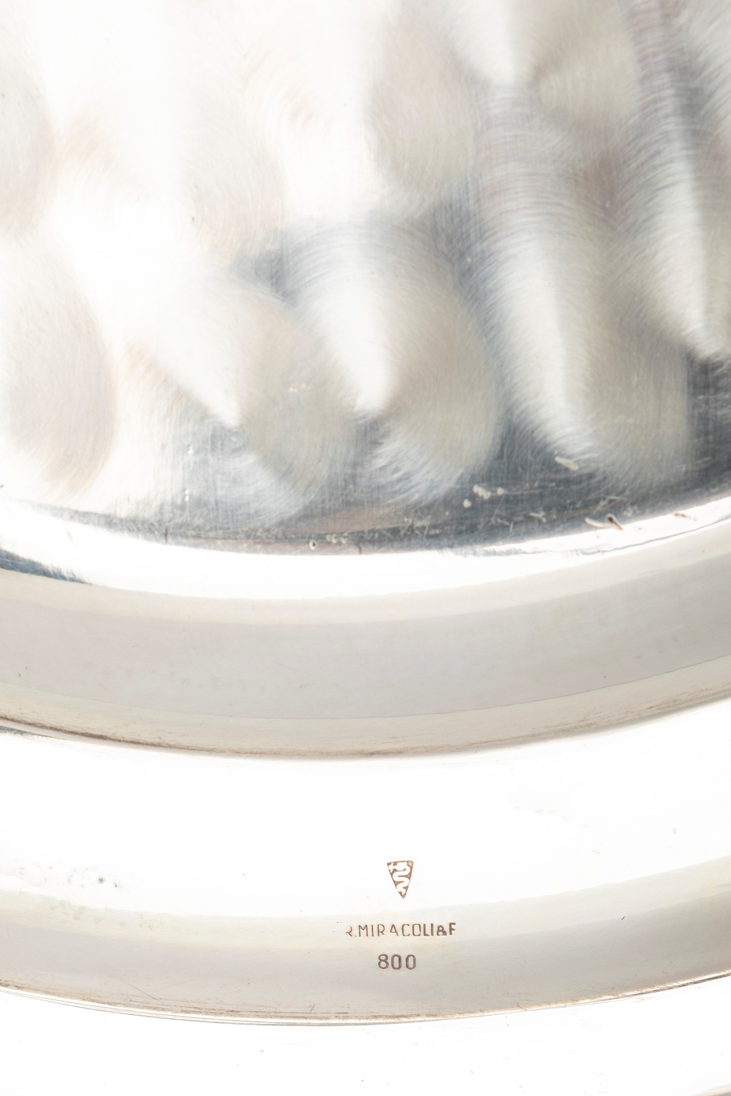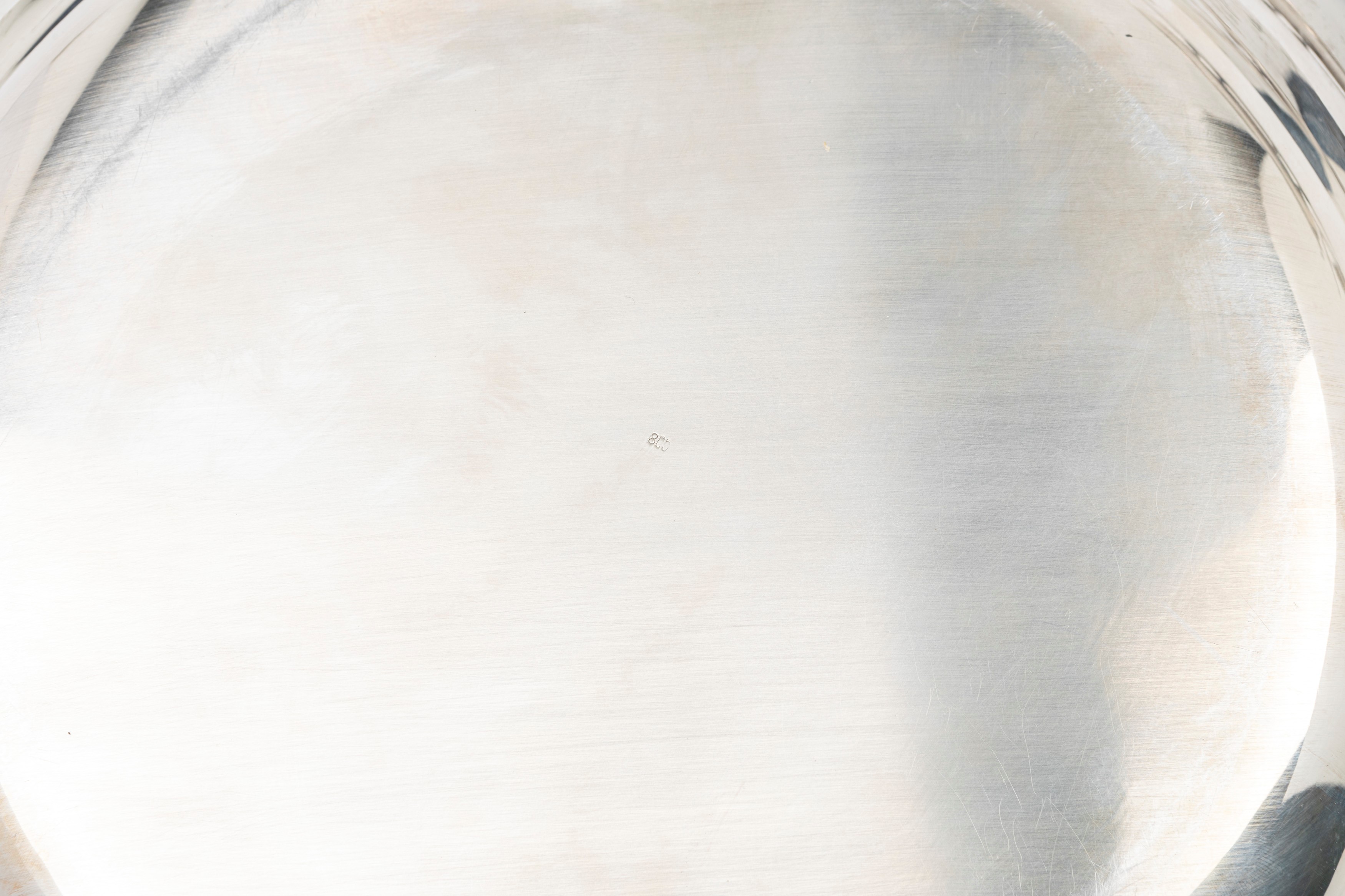 in silvercomposed of a round tray with gate edge (diam cm 36,00), round centerpiece with raised edge (diam cm 31,00), plate with drawstring edge (diam cm 31,00), oval bowl with drawstring edge (cm 14,00x19,00) and collect crumbs with a brush.