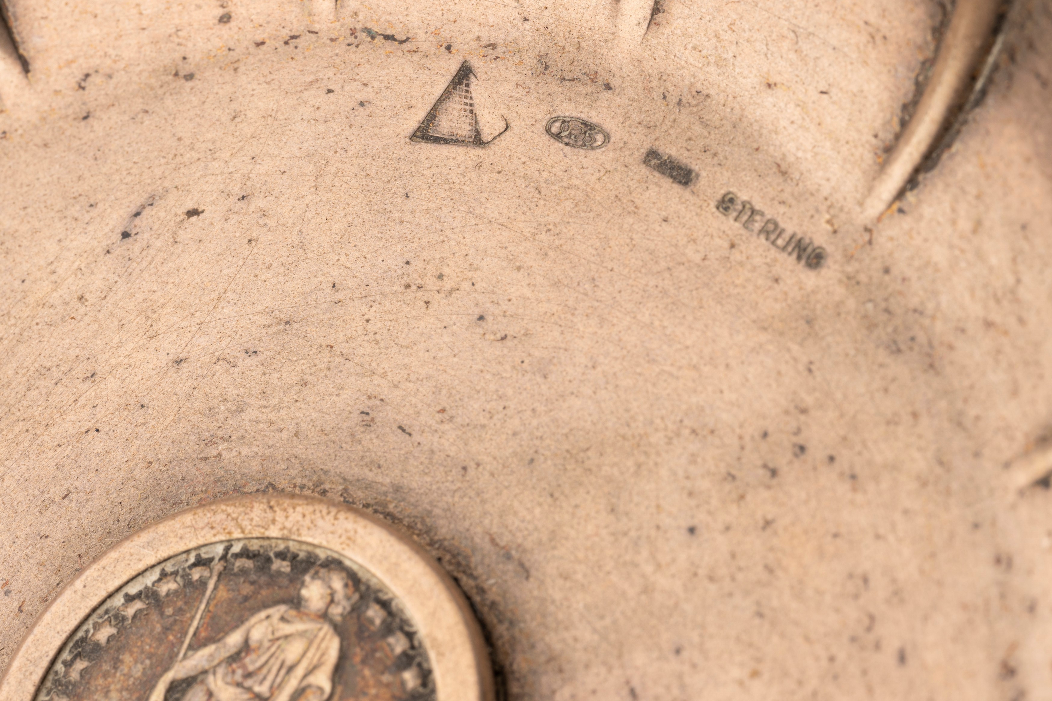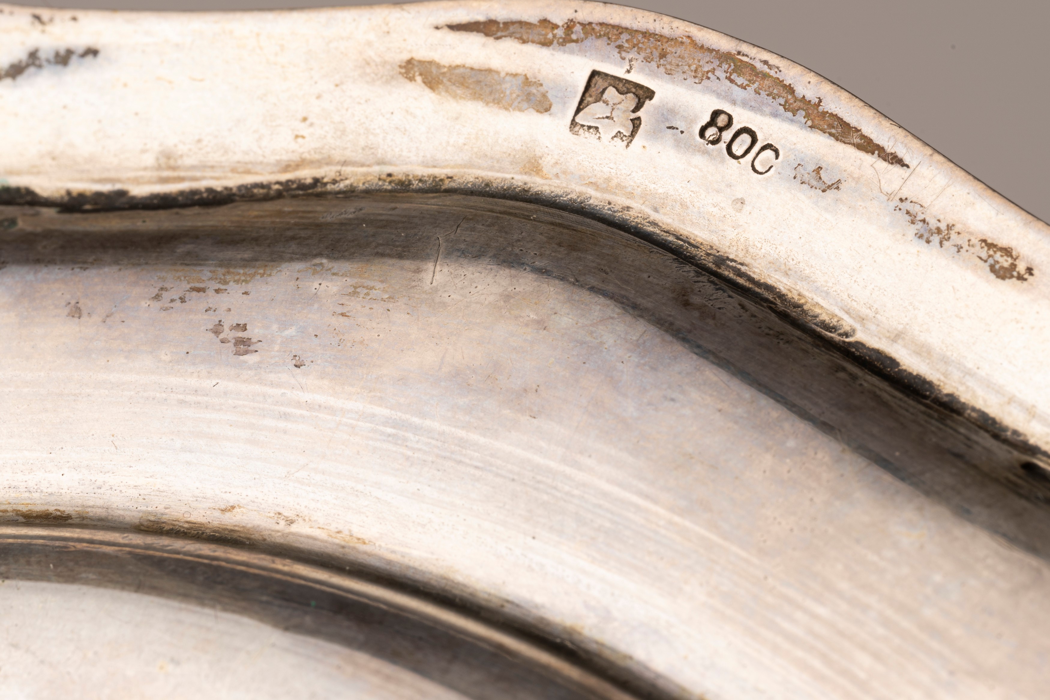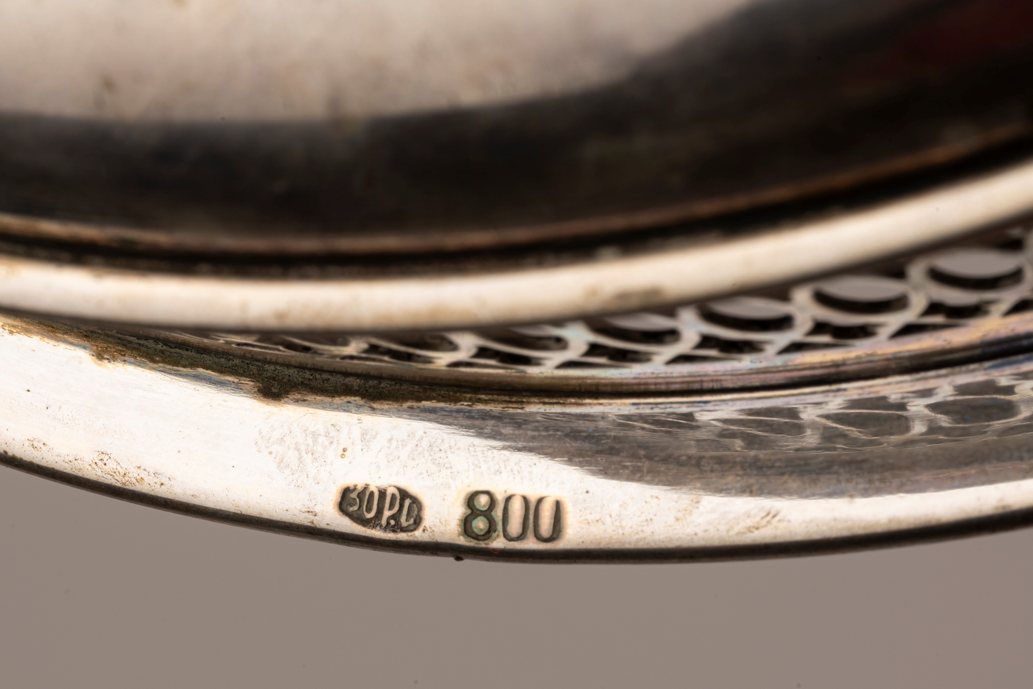 in silvercomposed of a plate (diam cm 29,50), a centerpiece with perforated edge resting on three feet (diam cm 24,00), thirteen saucers (diam cm 13,00), two plates with relief edge (diam cm 17,00), two plates with a mixtilinear profile (diam cm 18,00), a bowl with a sterling silver coin, a bowl with engraved star decorations (diam cm 16,00) and a rectangular pocket emptier with an octagonal profile engraved with "Piero and Stefania" (l cm 23,80x9,50).