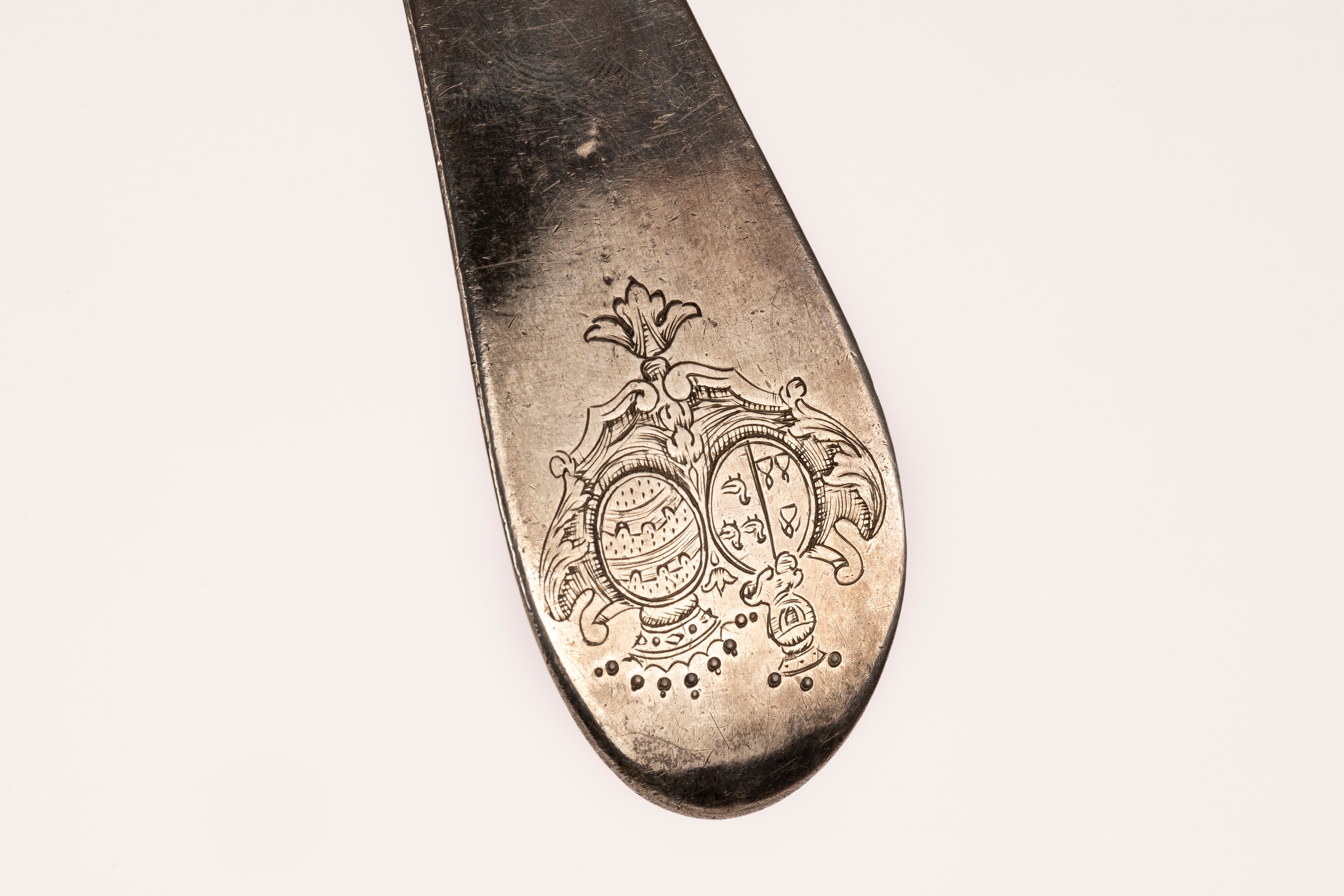 in silvercast and shaped, engraved noble coat of arms on the back.