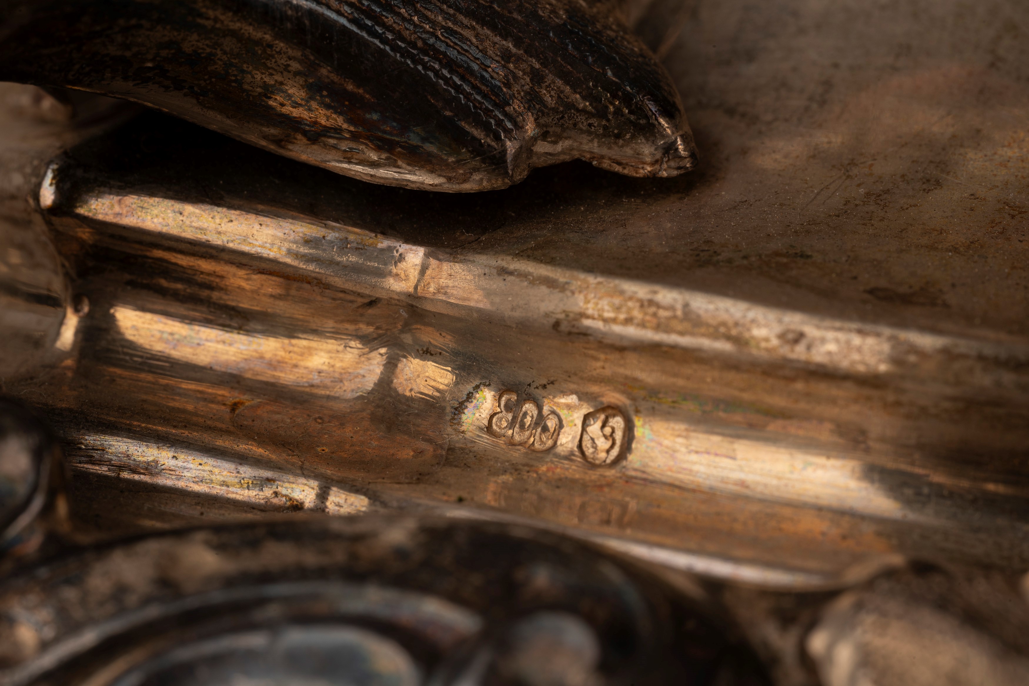 in argentowith five flames, cast, embossed and chiselled, richly decorated in relief with floral motifs, removable pine cone bobeche.