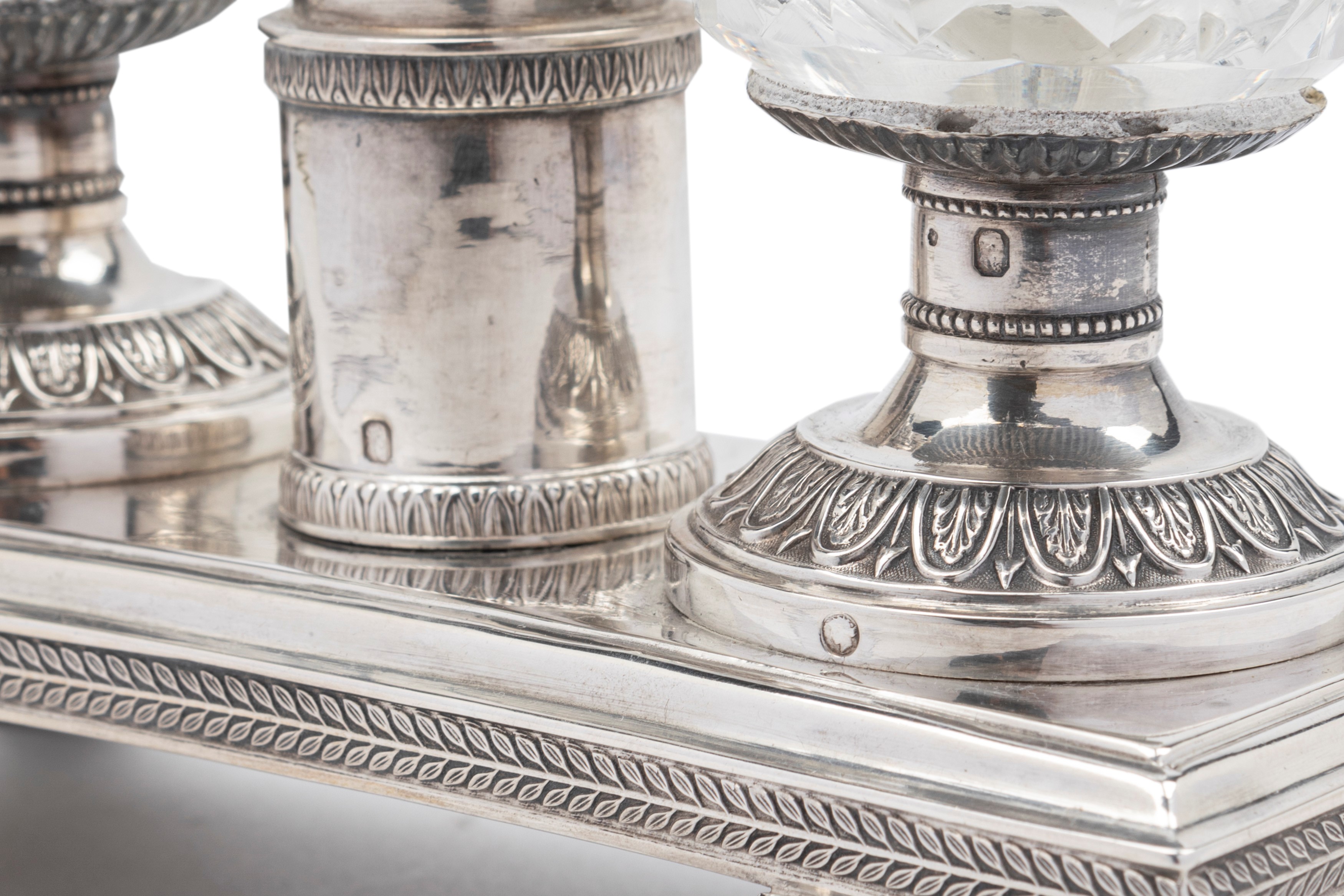 in silver 950rectangular in shape, resting on four feral feet, with cut crystal cups, defects (a chipped glass).