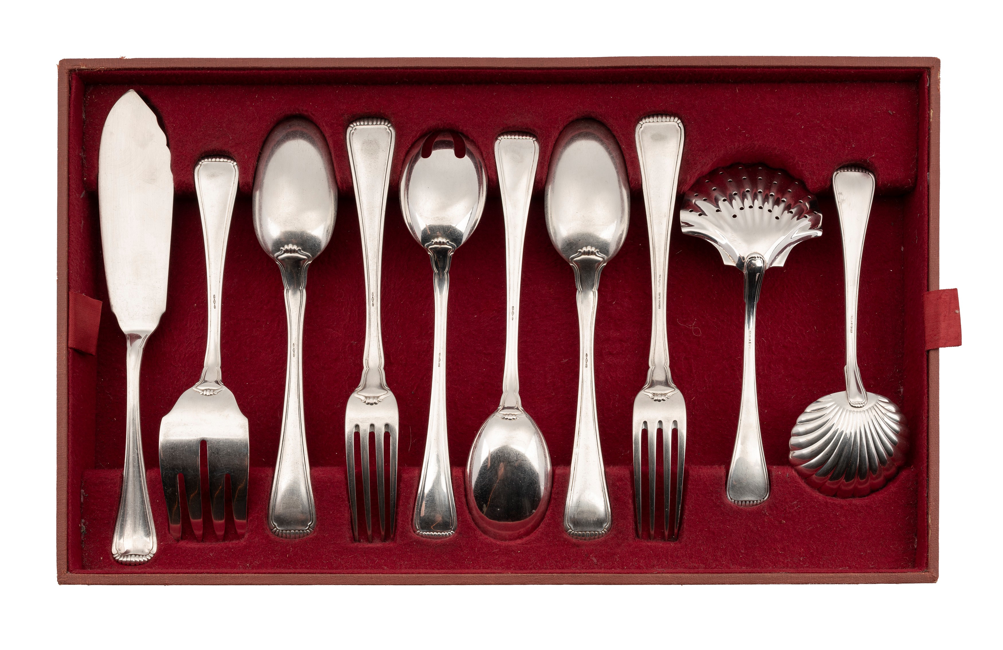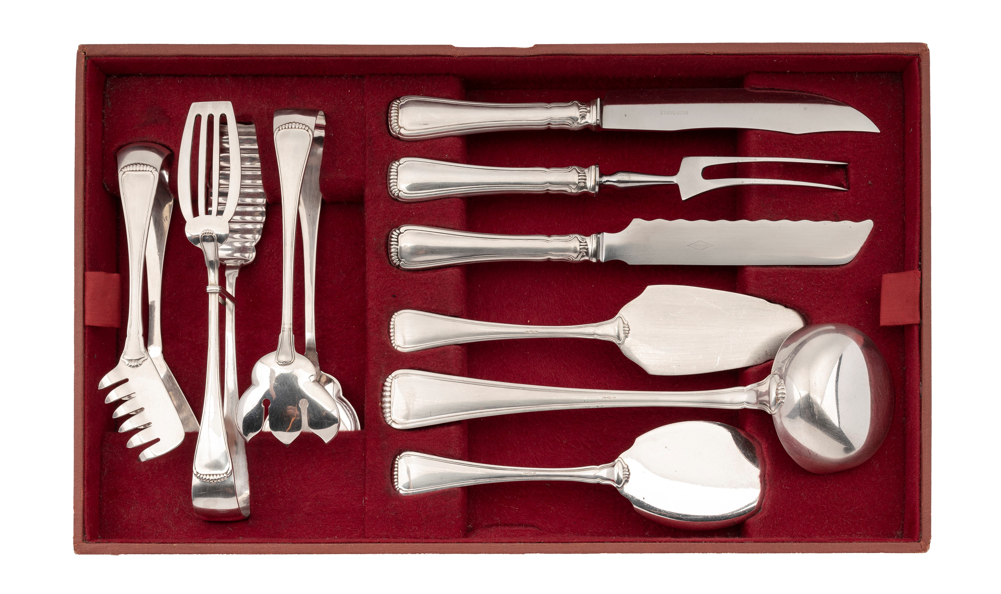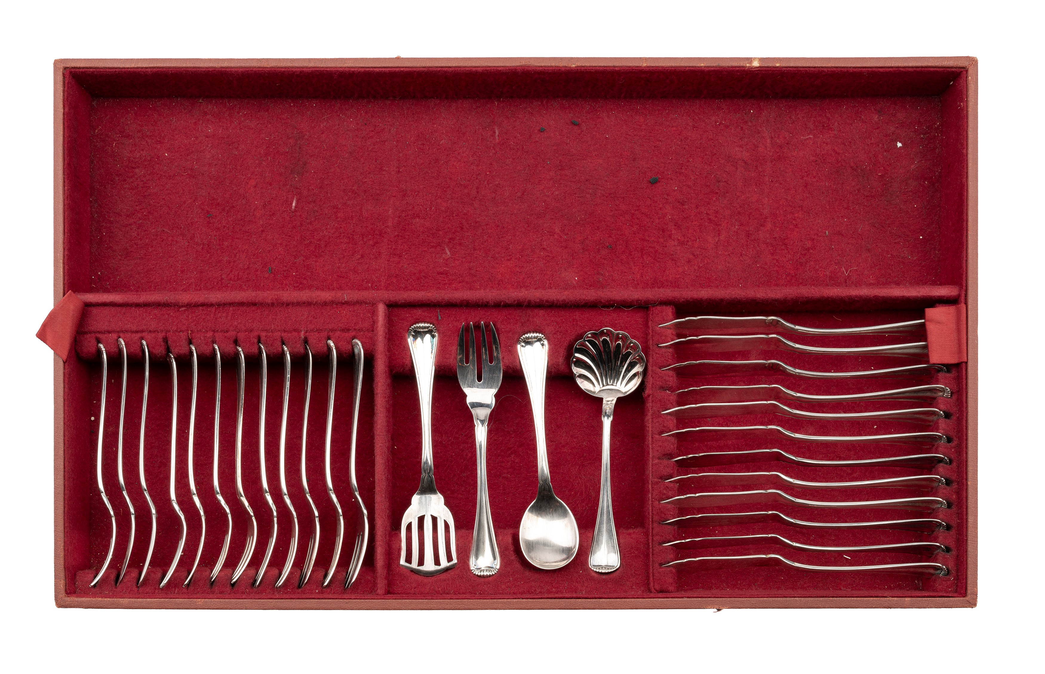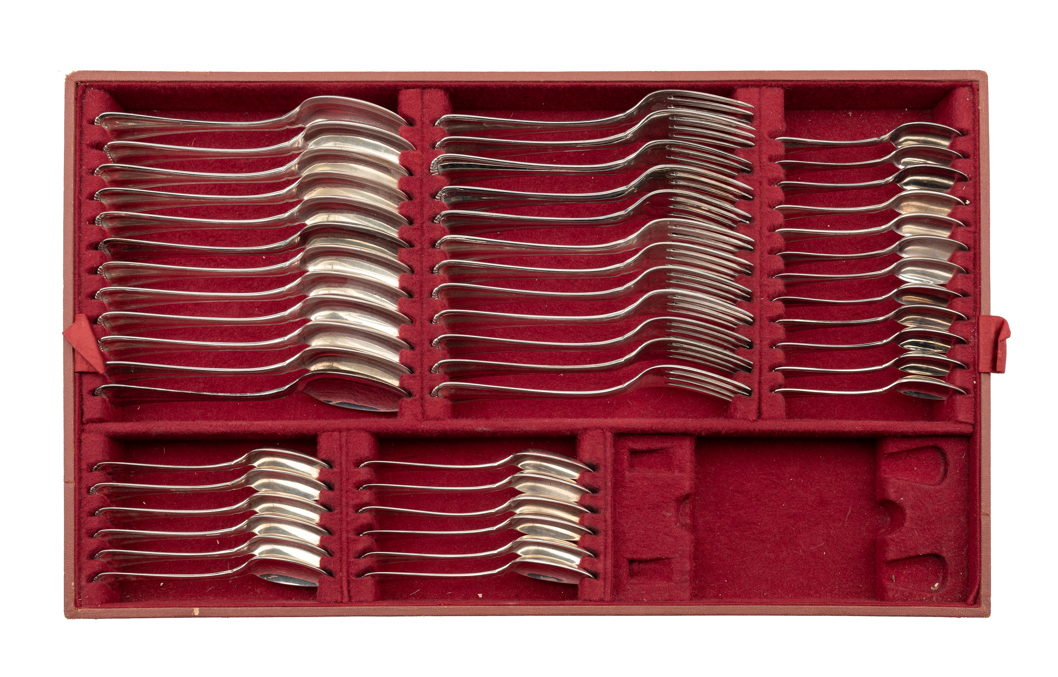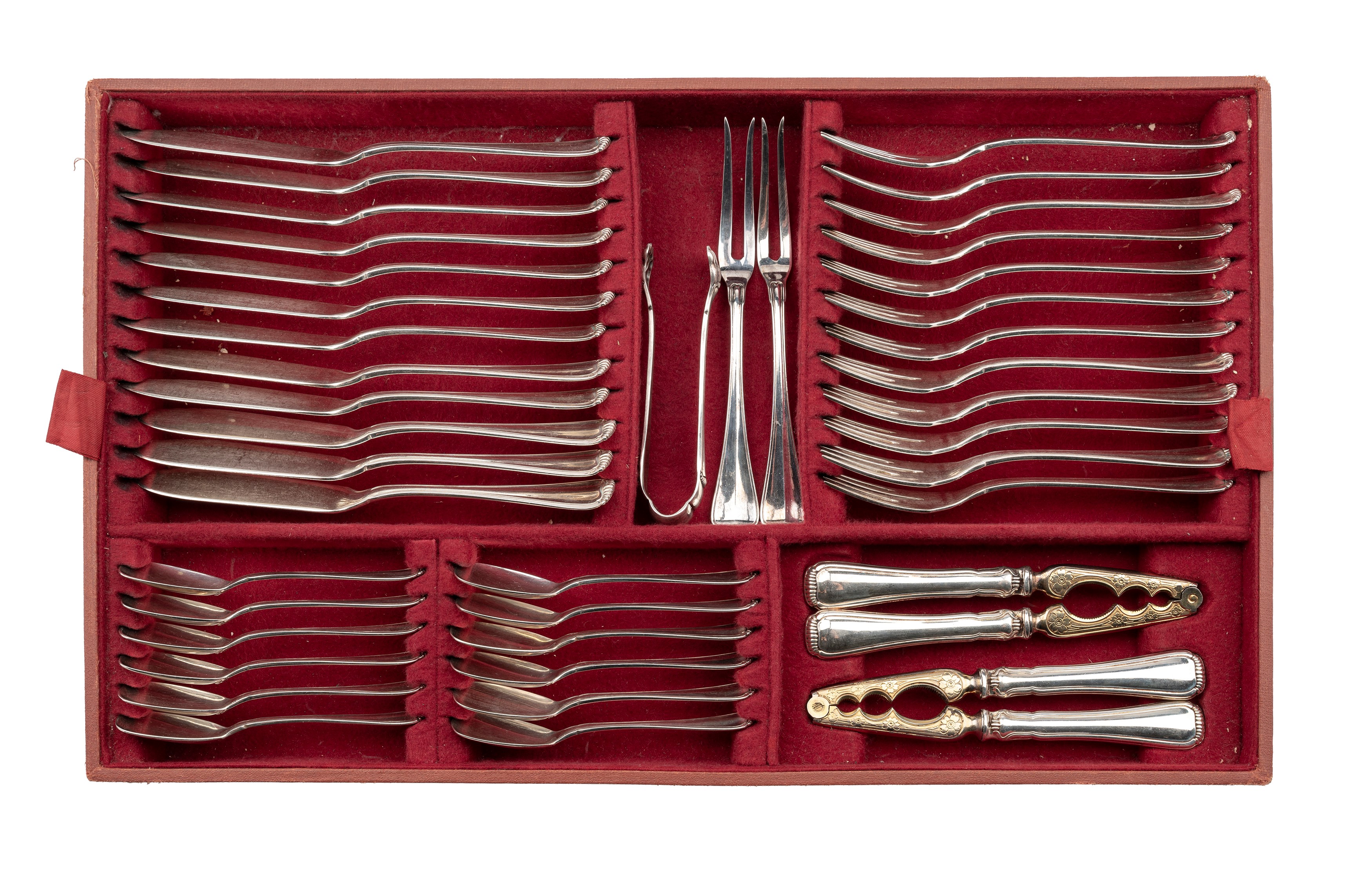 24 forks, 24 knives, 12 spoons, 12 fruit forks, 12 fruit knives, 12 fish forks, 12 fish knives, 12 dessert spoons, 12 fish starter knives, 12 fish starter forks, 12 tea spoons, 12 coffee spoons, 12 scoops ice cream, 8 small servings, 19 large servings (3 with steel blades), 2 nutcrackers;