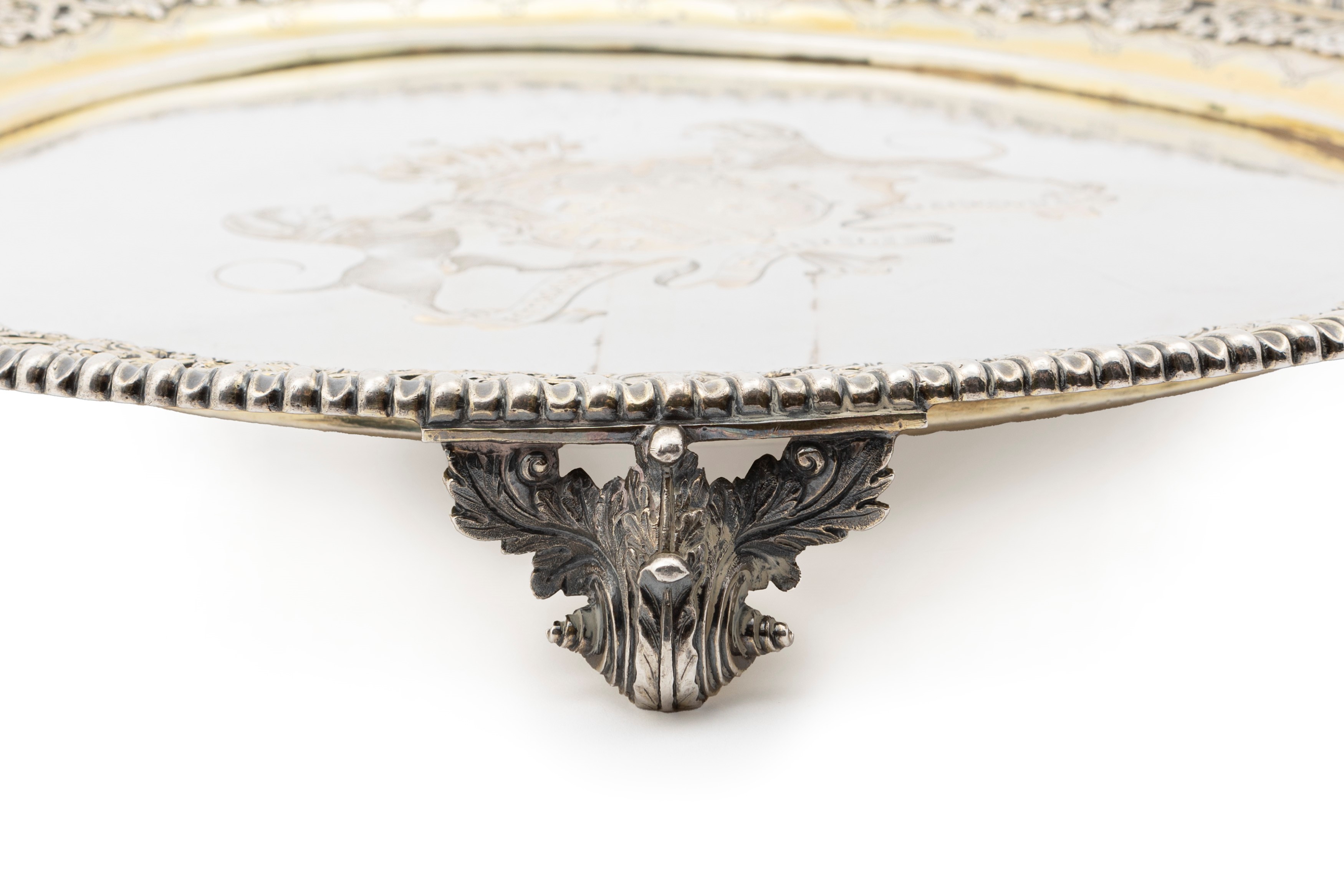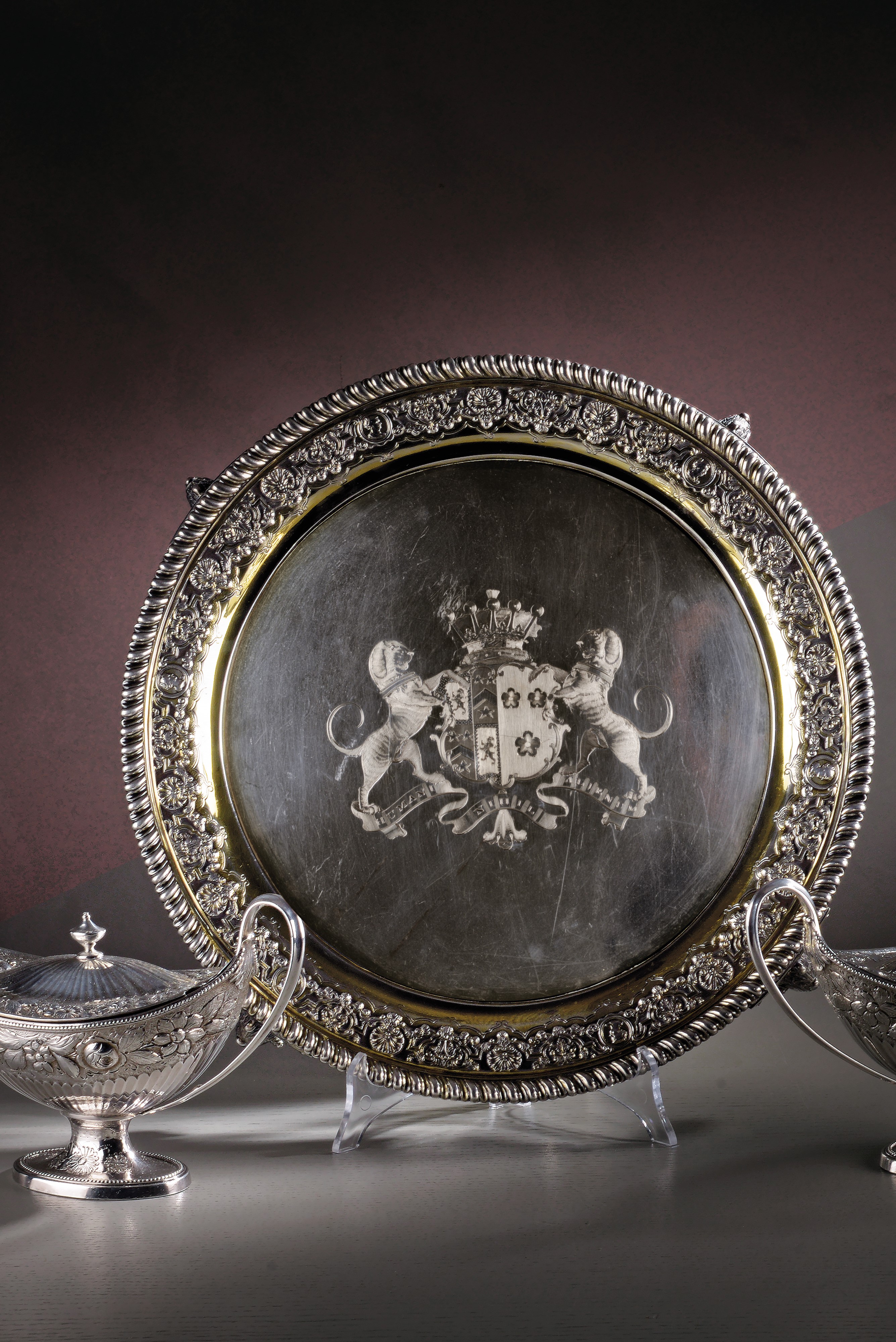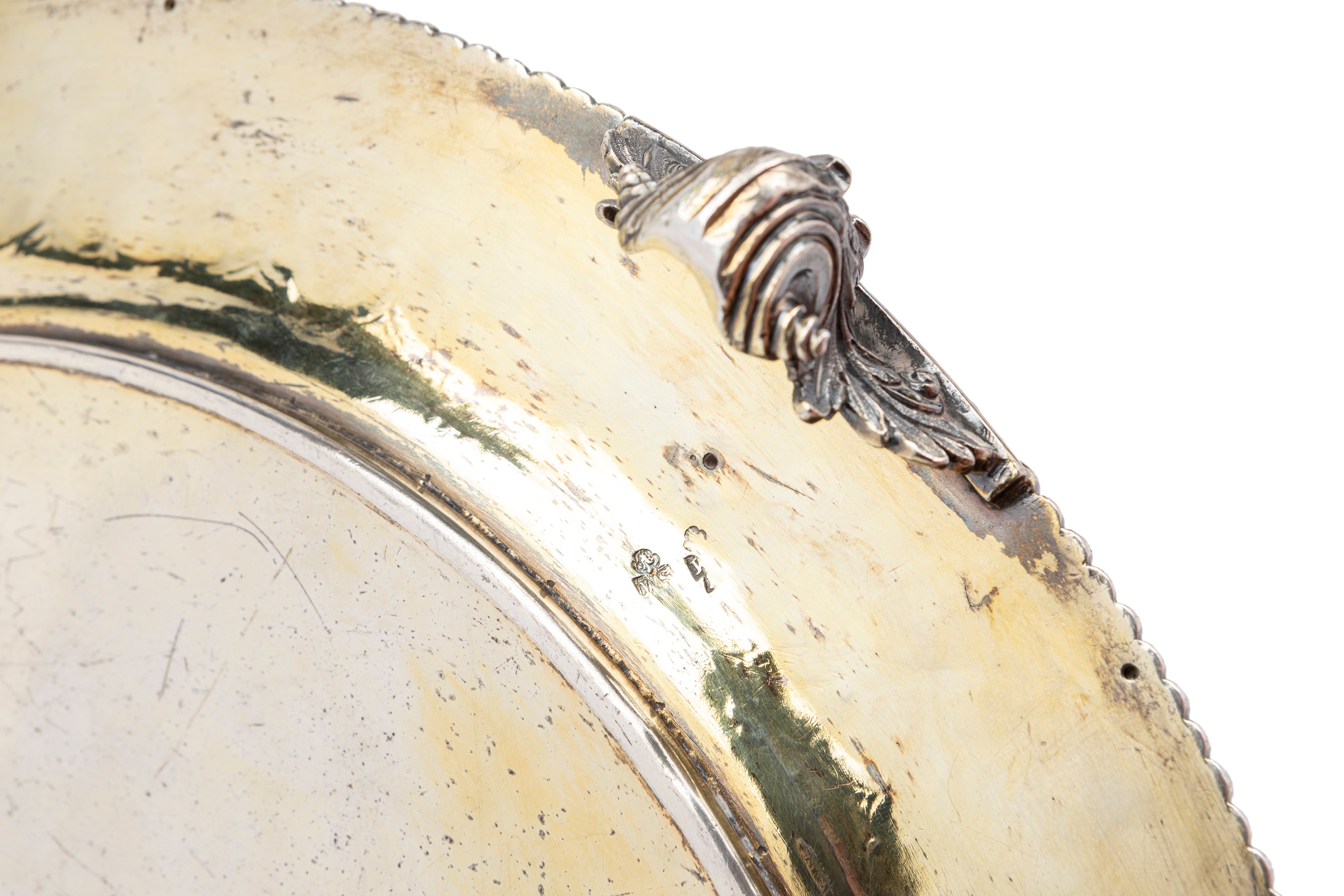probably made on the occasion of a wedding, it bears the engraved heraldic coat of arms of the Talbot family in the centre, with the motto "humani nihil alienum", richly embossed and chiselled, on four feet, circular edge with pods, defects (partially faded vermeil).