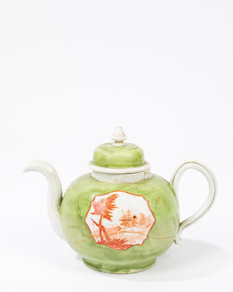 di forma globulare, ansa mossa, presa del coperchio a trottola, decorata con paesaggi in porpora entro riserve sagomate su fondo verde, il coperchio probabilmente non pertinente (restauri)